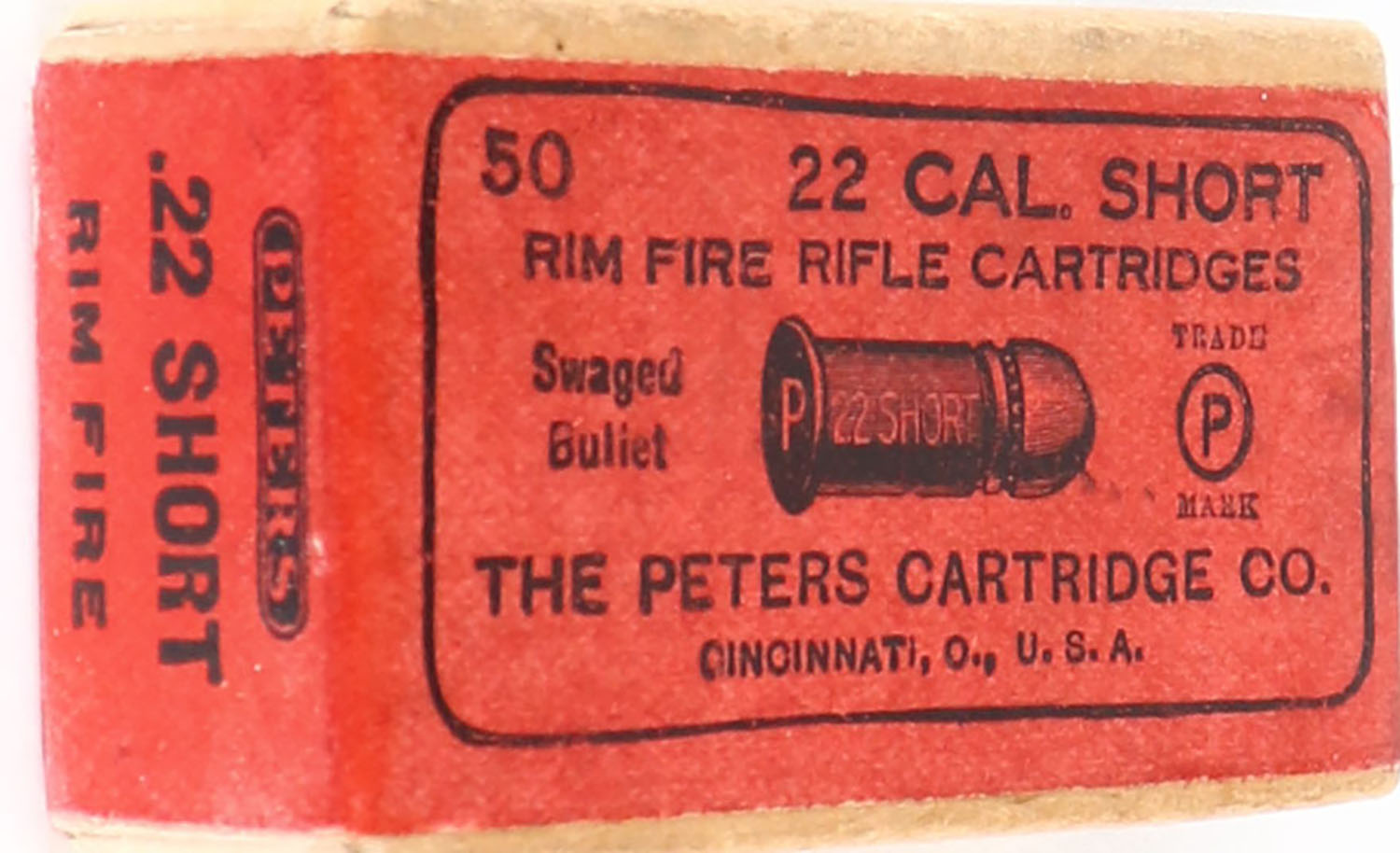 Peters, Rim Fire Rifle Cartridges, .22 Short, Swaged Bullet, RHWeb: PCC-4 S-1b, FULL & SEALED, 2pc. Buff box with red wraparound label, box is solid with excellent color, very minor color fading, corners are mostly sharp, edges are crisp, label is intact. Grade: Excellent + - Value: 20 to 80