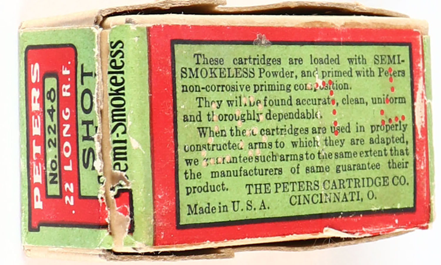Peters, R.F. Rifle Cartridges, .22 Long Shot, Chilled Shot, RHWeb: PCC-5A L-5c (A-1 bottom), Partial 44rds. 2pc. Buff box with green red & yellow wraparound label, box is solid with excellent color, very minor shelf wear, minor edge & corner wear, front of lid has been written on, label is intact, ammo is excellent. Grade: Excellent - Value: 30 to 90