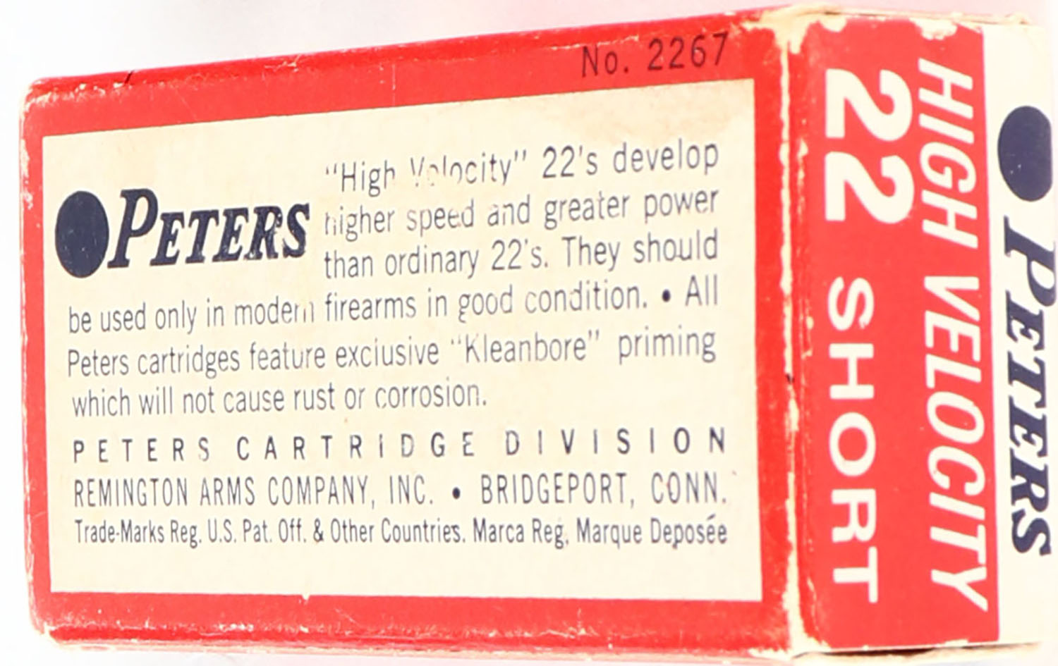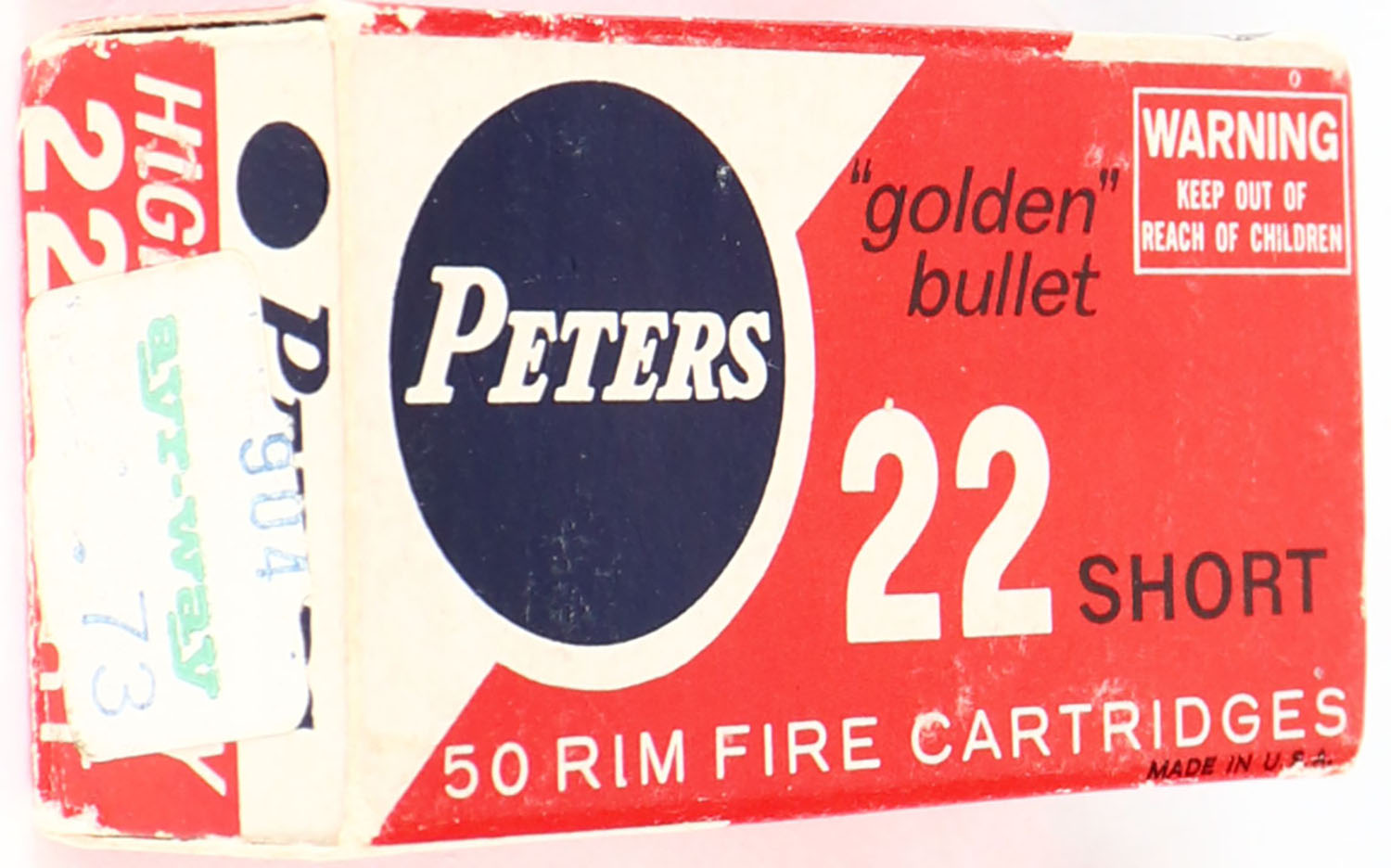 Peters, ''golden'' bullet, .22 Short, RHWeb: PCC-20 S-2a, Full, 1pc. Red white & blue box, box is solid with excellent color, very minor age soiling, minor corner wear, edges are crisp, end flaps are solid, ammo is minty. Grade: Excellent - Value: 6 to 30