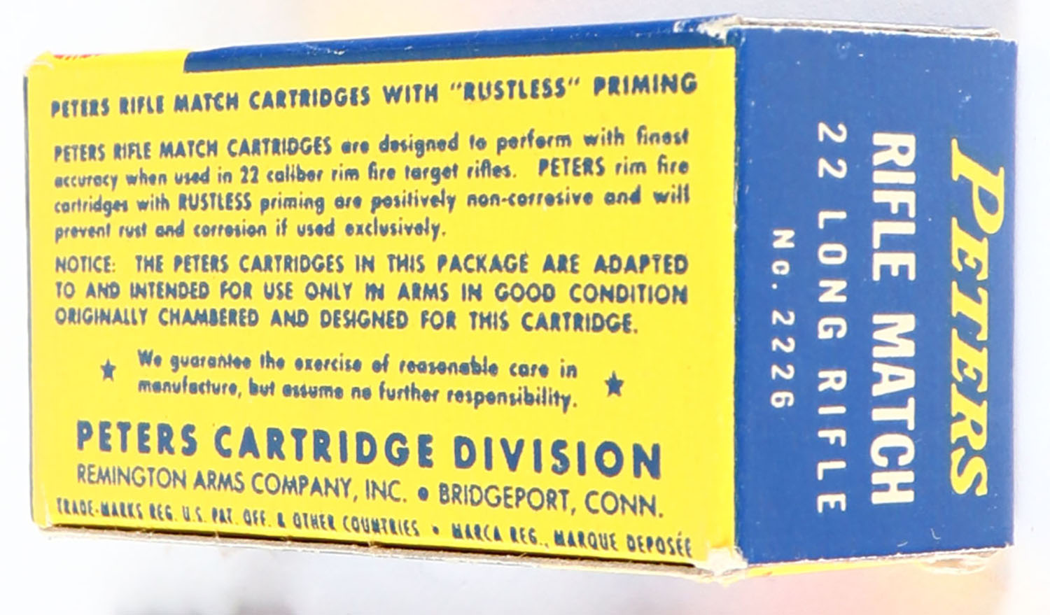 Peters, Rifle Match, .22 Long Rifle, RHWeb: PCC-55 LR-4.5, Full, 1pc. Blue yellow & red box, box is near mint with minty color, only very minor corner wear, edges are crisp, end flaps are solid, ammo is excellent to minty. Grade: Excellent + - Value: 30 to 90