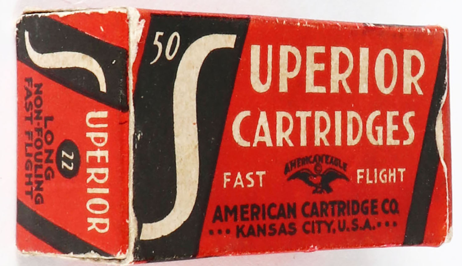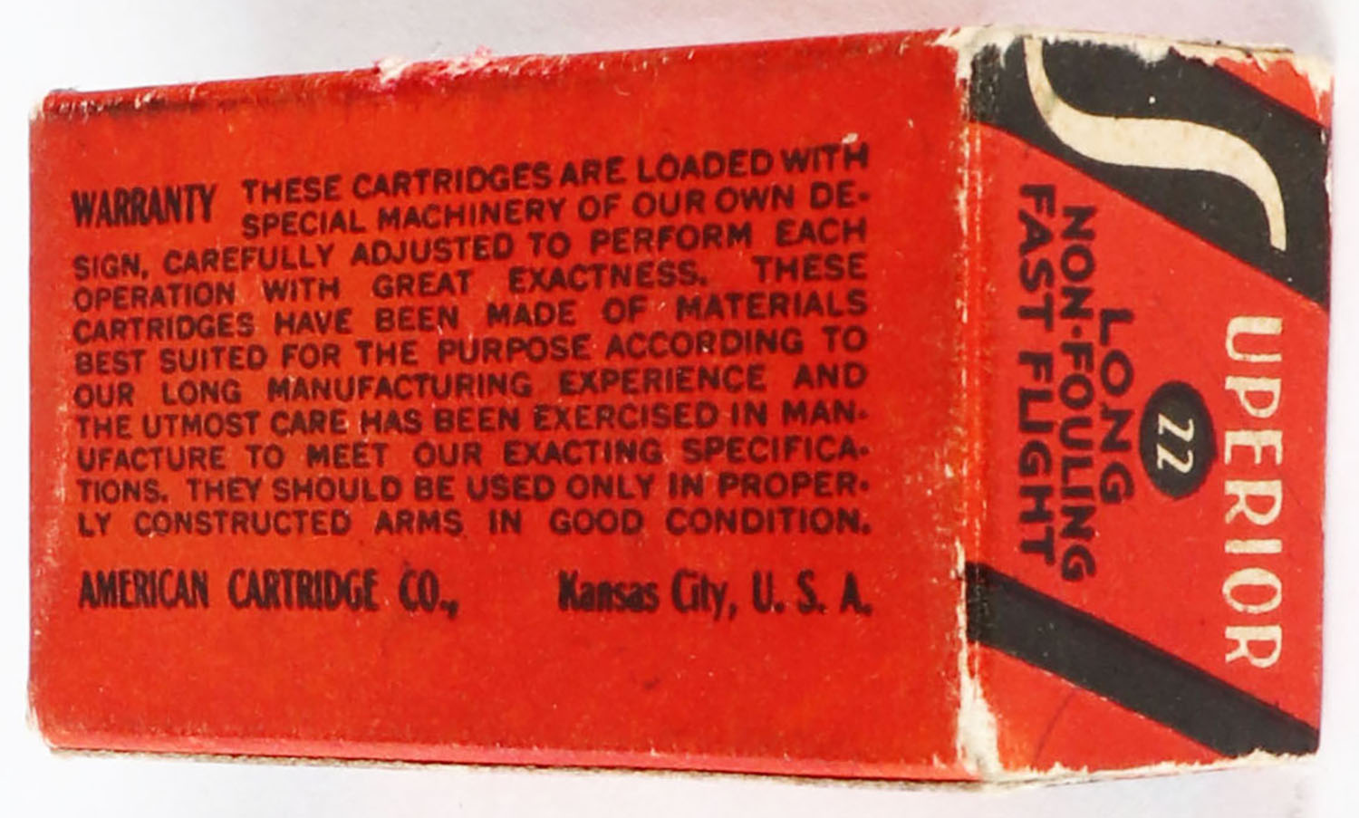 American, Superior Cartridges, .22 Long, Fast Flight, RHWeb: ACC-2 L-1b, Partial 23rds., 1pc. Red black & white box, box is solid with very good color, some age soiling & corner wear, very minor edge wear, end flaps are solid, ammo is excellent. Grade: Very Good ++ - Value: 4 to 20