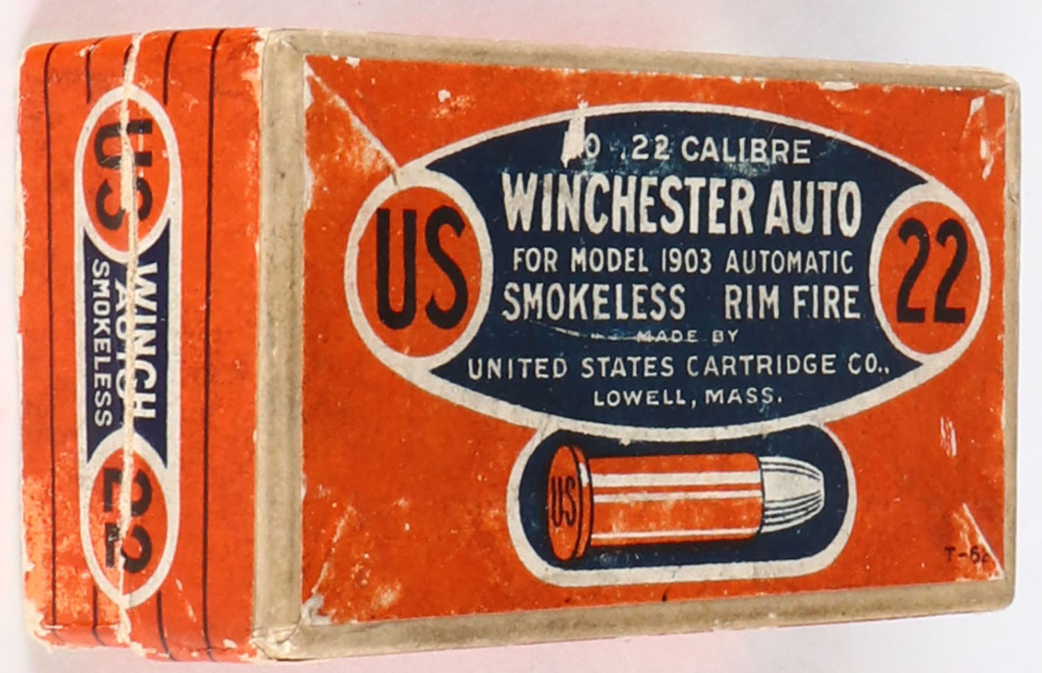 U.S., Smokeless Rim Fire, .22 Winchester Auto., RHWeb: US-7 WA-1a (printer code on top only), FULL & SEALED, 2pc. Buff box with orange/blue top & side sealing labels, box is solid with very good color, minor age soiling & shelf wear, corners are sharp, edges are crisp, labels are intact. Grade: Excellent - Value: 80 to 240