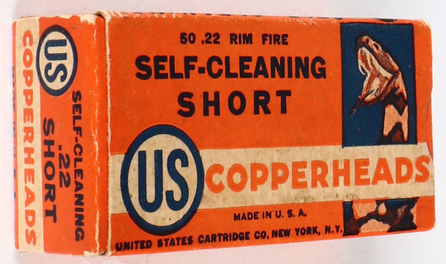 U.S., Copperheads, .22 Short, Self-Cleaning, RHWeb: US-12 S-1b, Full, 1pc. Orange white & blue box, box is solid with excellent color, minor age soiling, very minor corner wear, edges are crisp, end flaps are solid, ammo is excellent. Grade: Excellent + - Value: 30 to 90