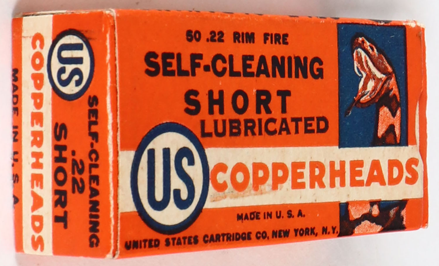 U.S., Copperheads, .22 Short, Self-Cleaning Lubricated, RHWeb: US-12 S-2b, Full, 1pc. Orange white & blue box, box is near mint with excellent color, only very minor age soiling & corner wear, edges are crisp, end flaps are solid, ammo is very good. Grade: Excellent ++ - Value: 40 to 160
