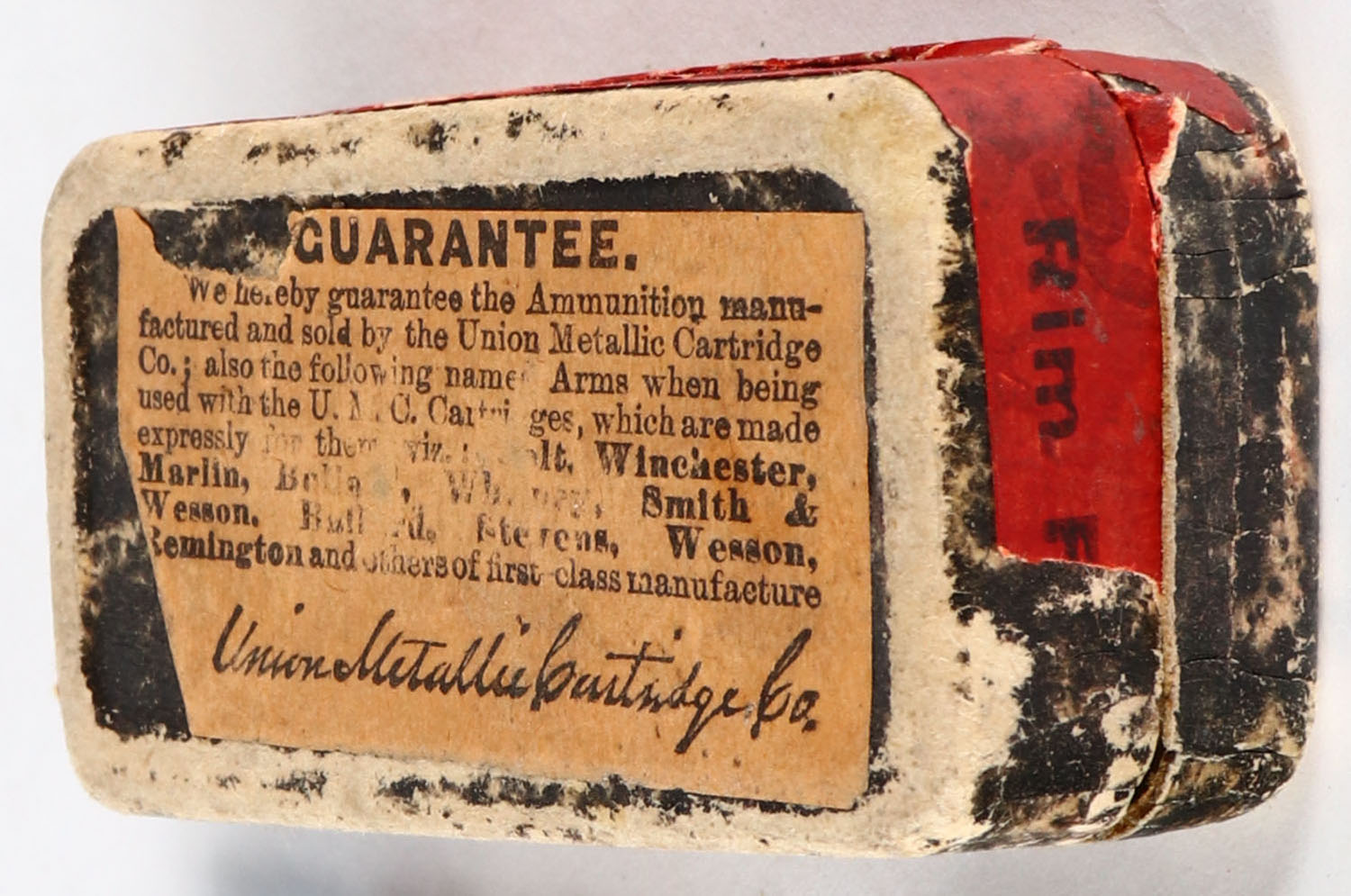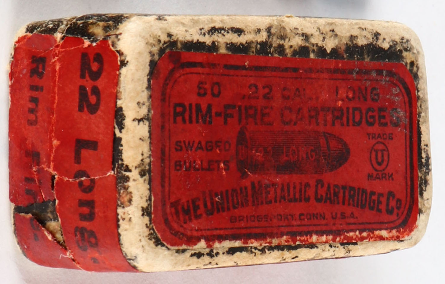 UMC, Rim-Fire Cartridges, .22 Long, Swaged Bullets, RHWeb: UMC-8 L-1b, Full, 2pc. Black mottled box with red top & side sealing labels, box is solid with good to very good color, minor age soiling, edge & corner wear, side sealing labels are 60% intact, ammo is excellent. Grade: Good ++ - Value: 40 to 160