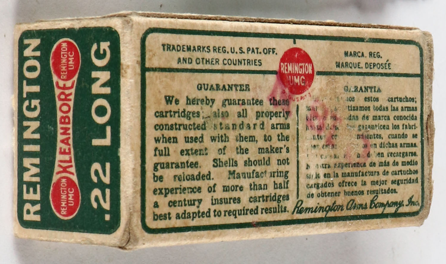 Remington, Kleanbore, .22 Long, RHWeb: REM-7.1B L-1d, Full, 1pc. Green buff & red dog bone box, left end flap is torn, very good to excellent color, stain on front, some shelf wear, minor corner wear, very minor edge wear, right end flap is solid, ammo is very good. Grade: Very Good - Value: 10 to 40