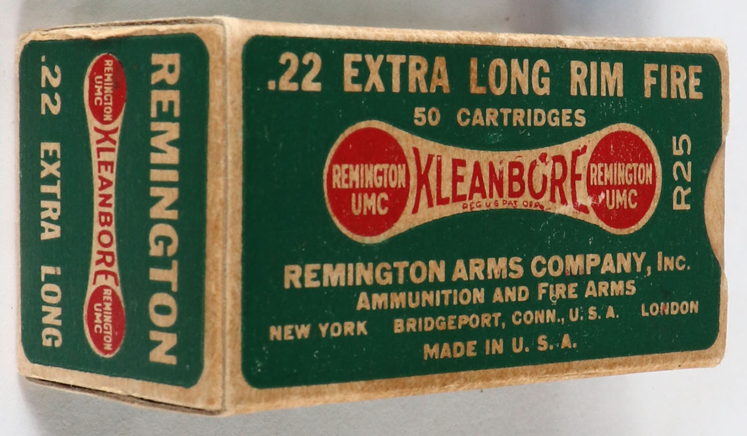 Remington, Kleanbore, .22 Extra Long, R25, RHWeb: REM-7.1B XL-1c, Full, 1pc. Green buff & red dog bone box, box is solid with excellent color, very minor age soiling & corner wear, corners are somewhat sharp, edges are crisp, end flaps are solid, ammo is excellent. Grade: Excellent + - Value: 150 to 450