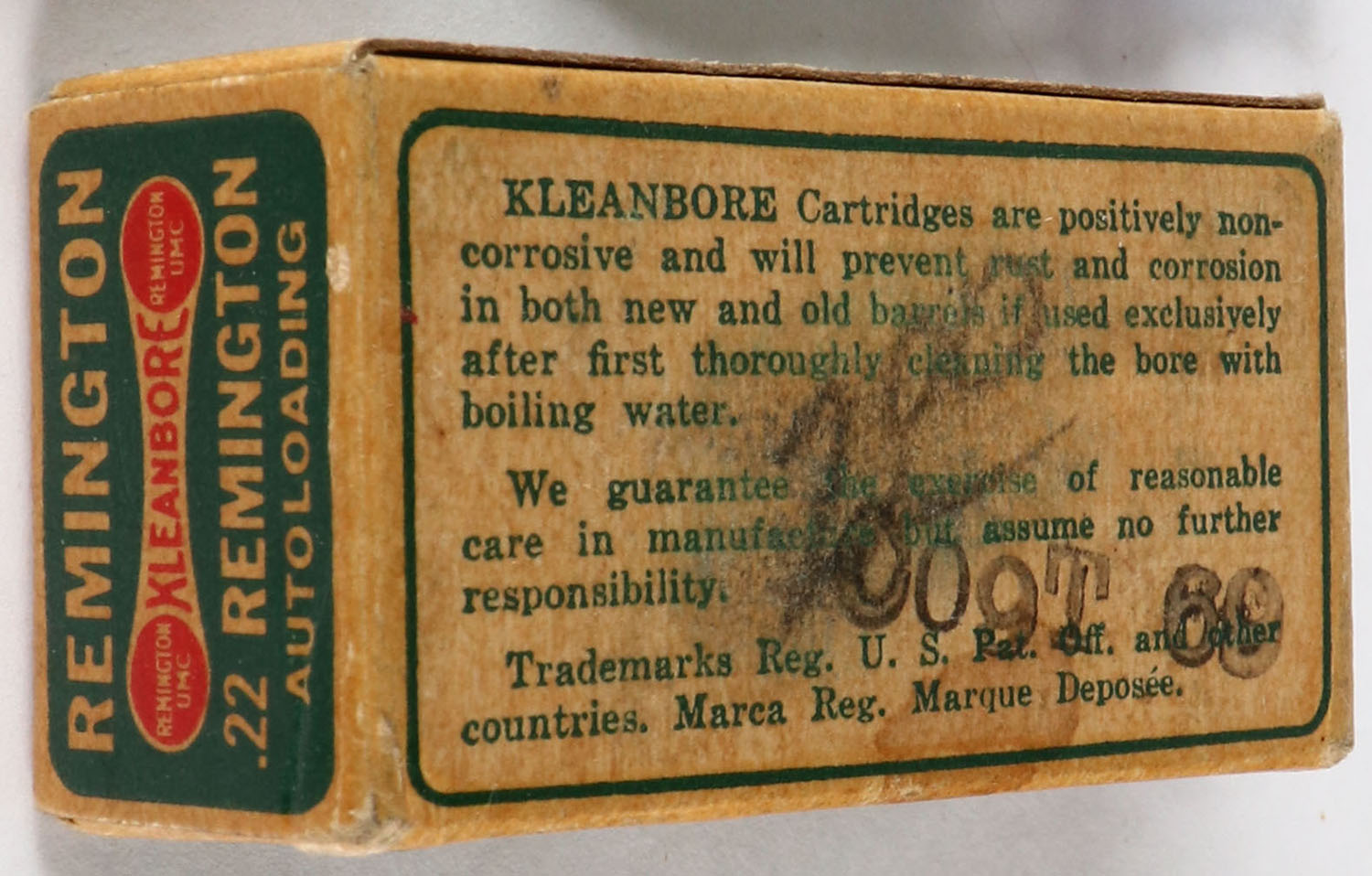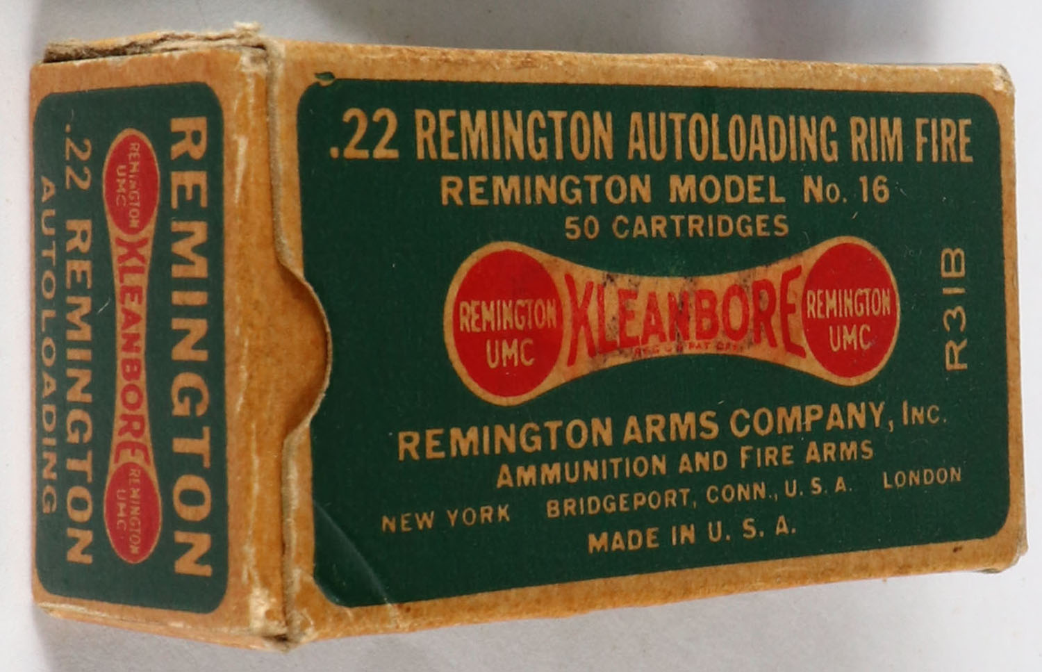 Remington, Kleanbore, .22 Remington Autoloading, RHWeb: REM-7.1B, Partial 48rds. 1pc. Green buff & red dog bone box, box is solid with very good color, minor age soiling, box has been lacquered, corner ding to top front corner, edges are mostly crisp, end flaps are solid, ammo is excellent. Grade: Very Good ++ - Value: 30 to 90