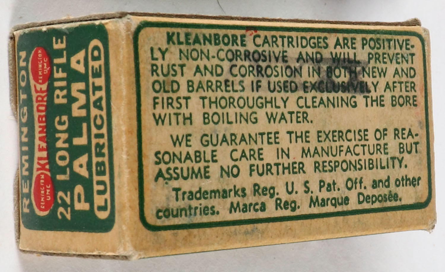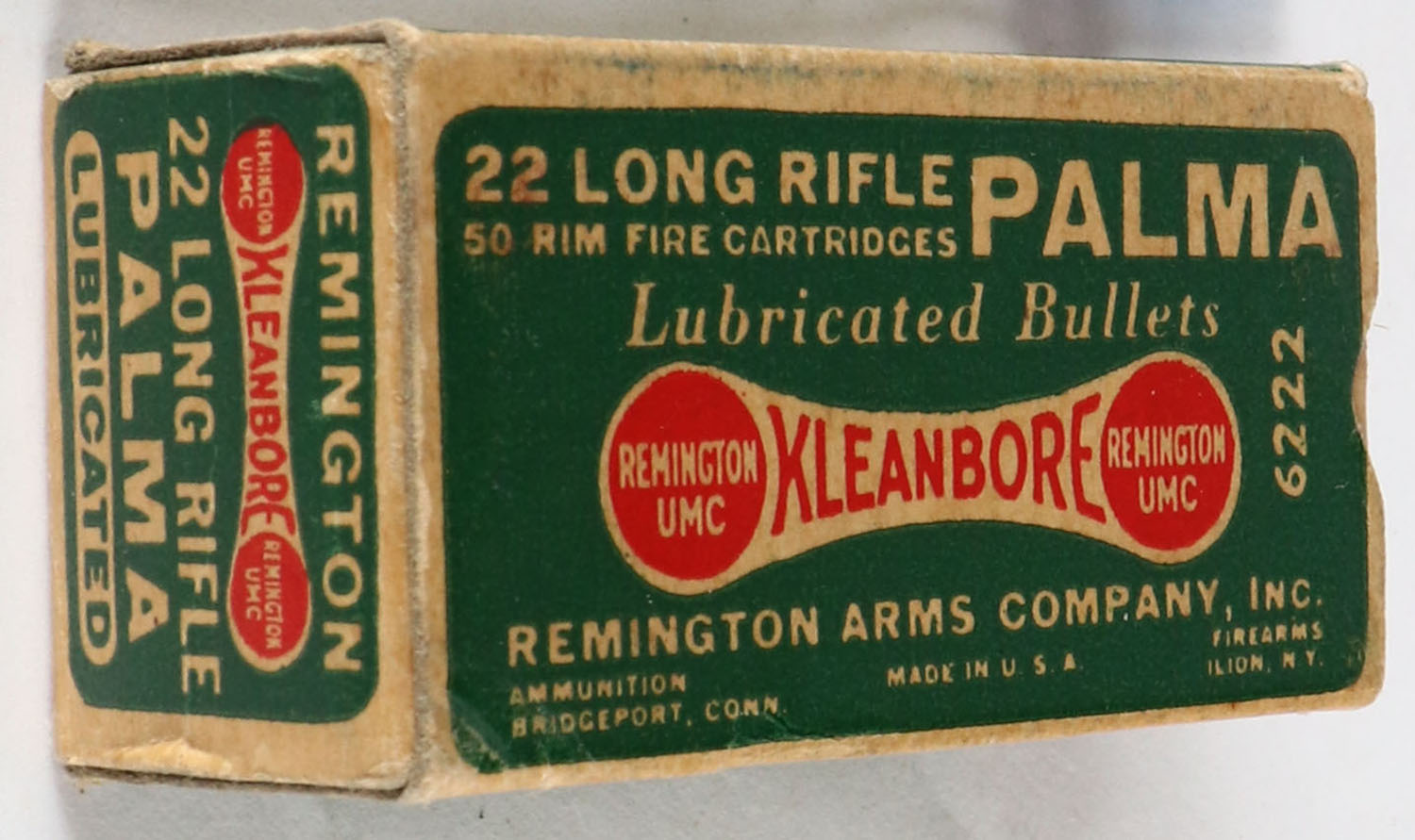 Remington, Palma Kleanbore, .22 Long Rifle, RHWeb: REM-52 LR-13, Full, 1pc. Green buff & red dog bone box, box is solid with very good to excellent color, minor age soiling & corner wear, edges are mostly crisp, end flaps are solid, ammo is excellent. Grade: Excellent - Value: 8 to 40