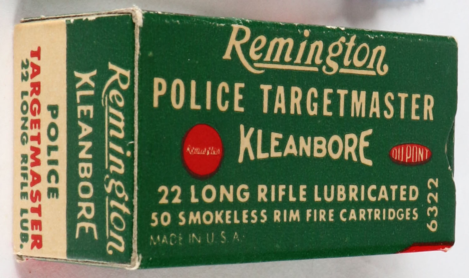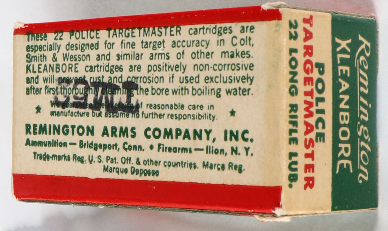 Remington, Police Targetmaster, .22 Long Rifle, RHWeb: REM-69 LR-2d, Full, 1pc. Green white & red box, box is solid with excellent color, very minor corner wear, edges are crisp, end flaps are solid, ammo is excellent. Grade: Excellent + - Value: 20 to 80