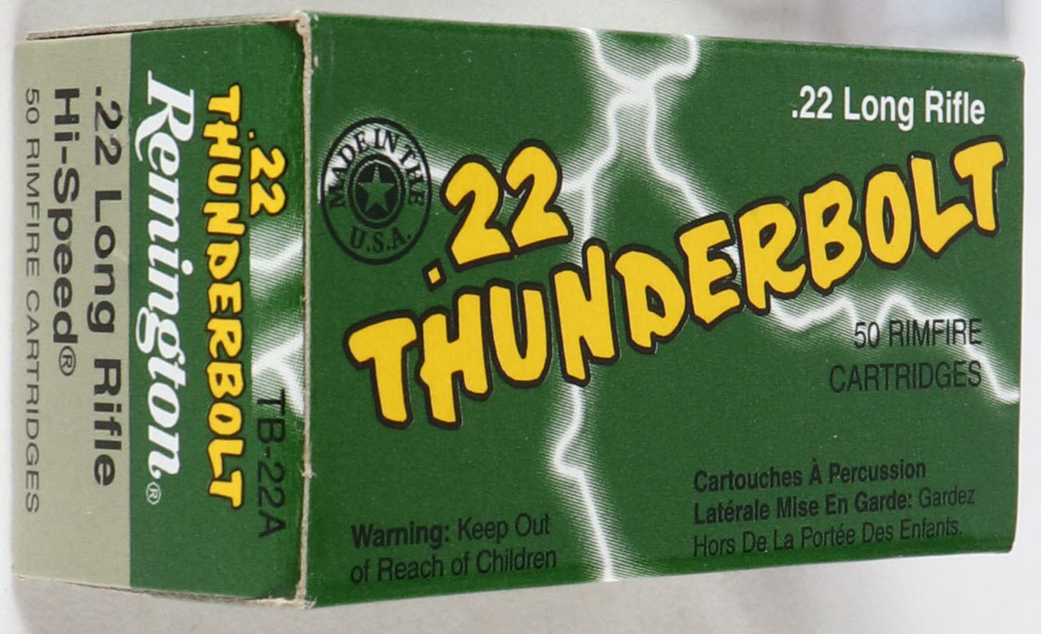 Remington, Thunderbolt, .22 Long Rifle, Full, 1pc. Green yellow & gray box, box is MINT with mint color, corners are sharp, edges are crisp, end flaps are solid, ammo is mint. Grade: MINT - Value: 4 to 20