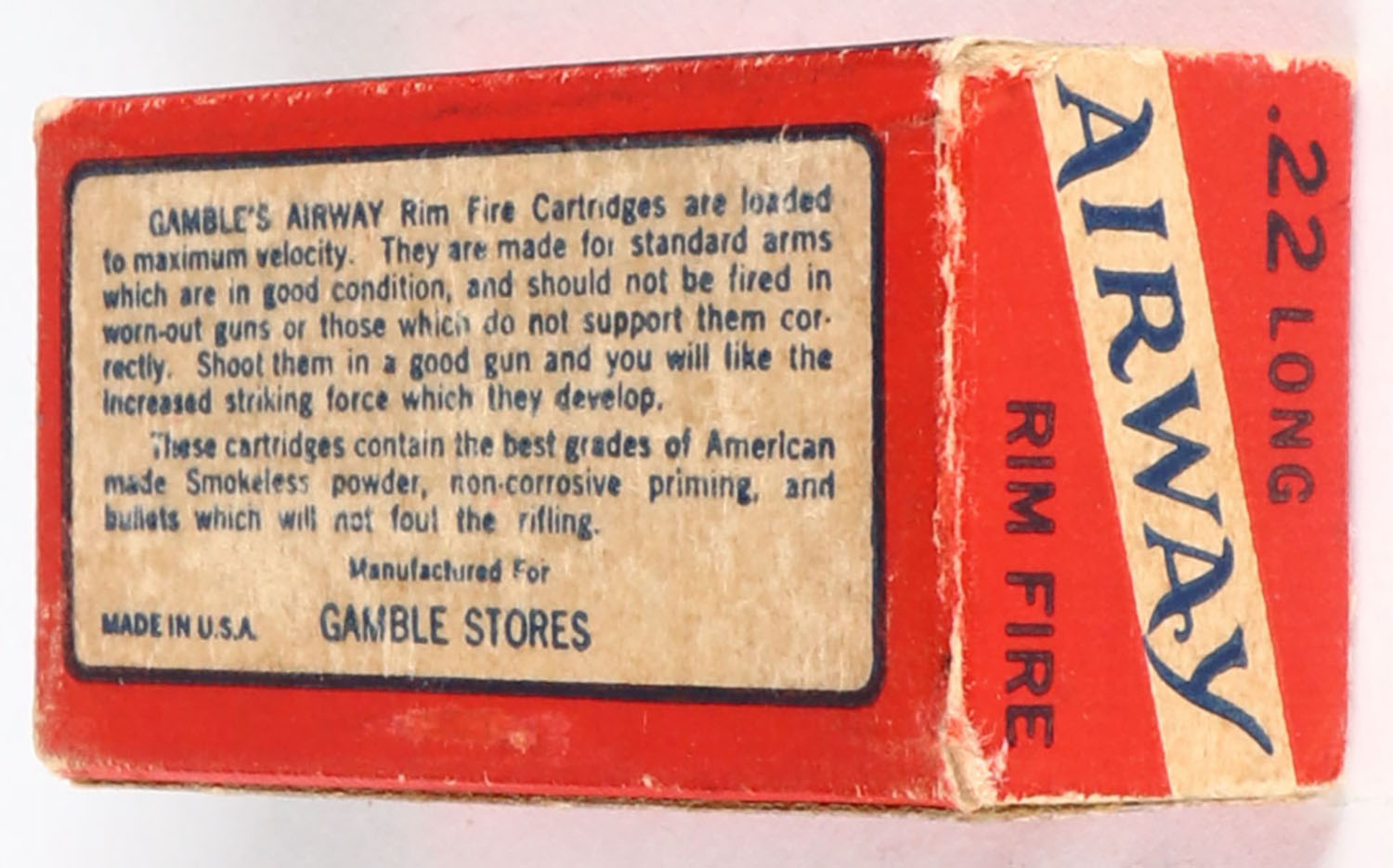 Gambles, Airway, .22 Long, RHWeb: GS-1 L-1c, Full, 1pc. Red white & blue box, box is solid with very good color, some age soiling & corner wear, minor edge wear, end flaps are solid, ammo is excellent. Grade: Very Good ++ - Value: 20 to 80