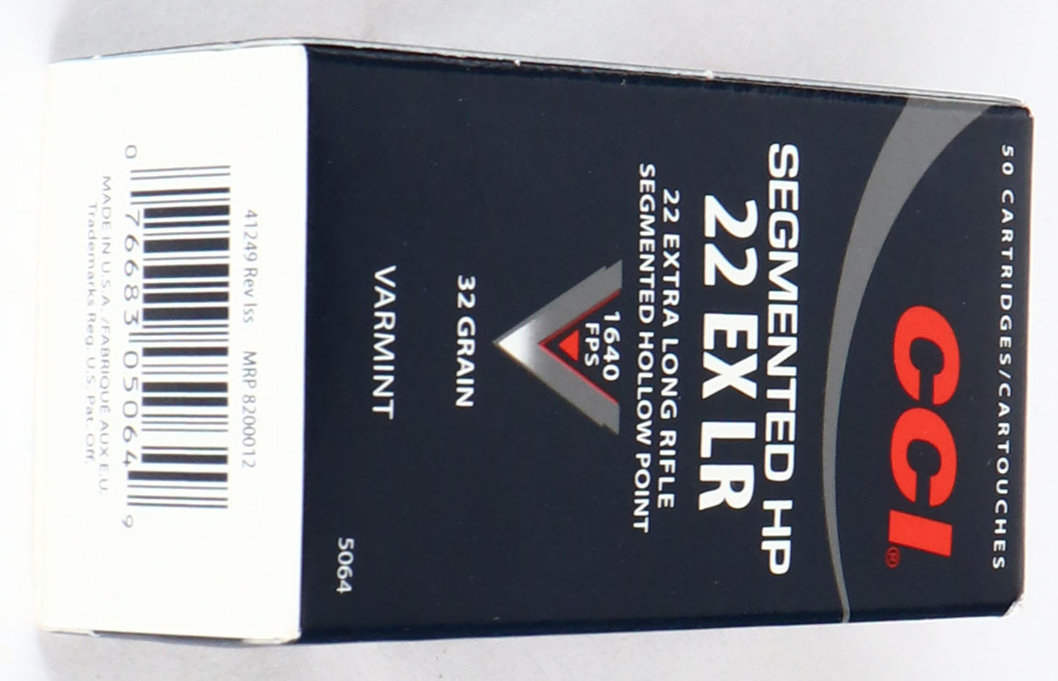 CCi, Segmented HP, .22 EX Long Rifle, 32 Grain Segmented Hollow Point, 1640 FPS, Full, 1pc. Blue white & red box, box is MINT with mint color, corners are sharp, edges are crisp, end flaps are solid, ammo is mint. Grade: MINT - Value: 10 to 50