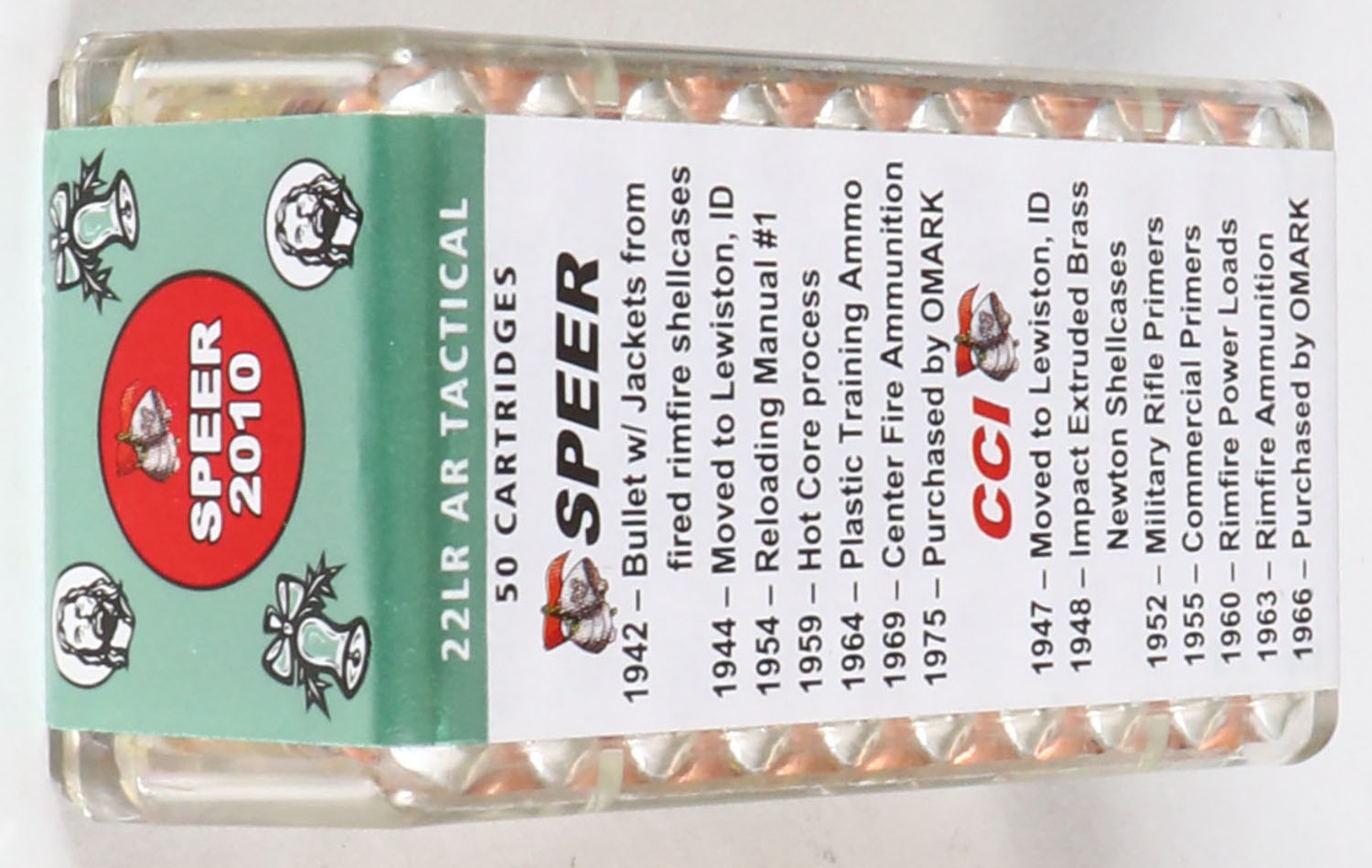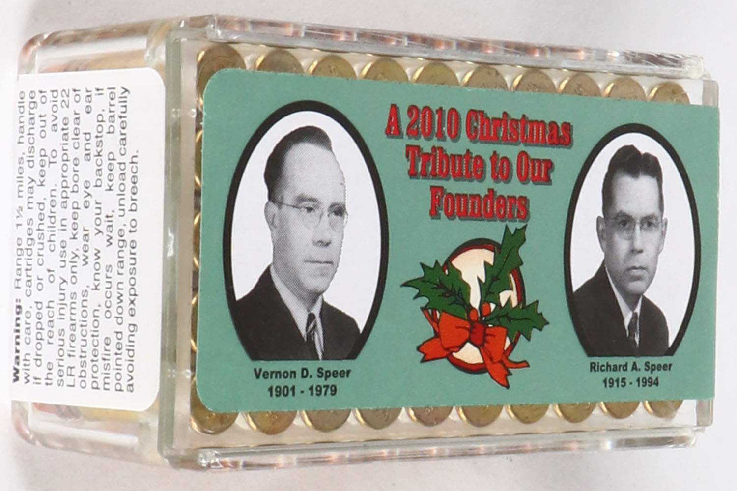 CCi, Merry Christmas 2010, .22 Long Rifle, AR Tactical, RHWeb: CCI-19 LR-7, FULL & SEALED, 2pc. Clear plastic tray with label featuring CCI founders Vernon & Richard Speer, plastic tray is clean & clear, label is intact with minty color. Grade: MINT - Value: 40 to 120