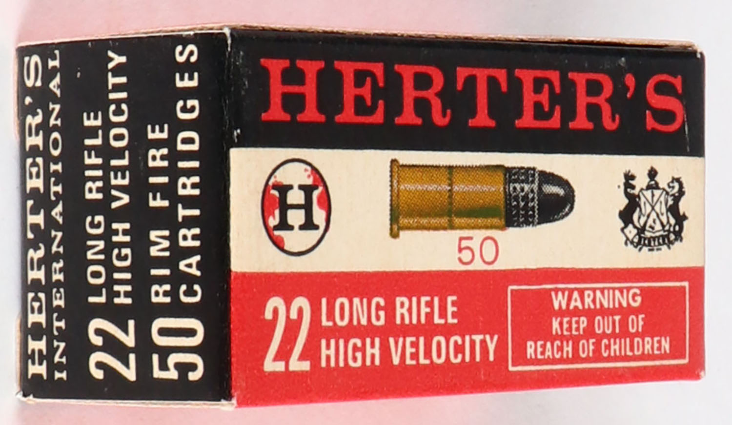 Herters, High Velocity, .22 Long Rifle, RHWeb: HERT-1, LR-1a, Partial 48rds. Correct, 1pc. Red black & white box, box is solid with excellent color, very minor shelf wear, corners are sharp, edges are crisp, end flaps are solid, ammo is excellent. Grade: Excellent + - Value: 6 to 30