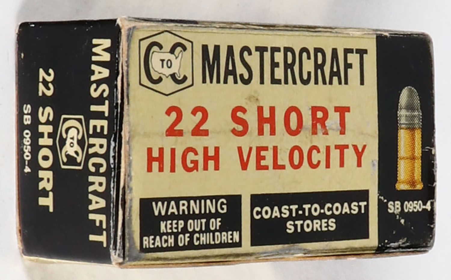 Coast to Coast, Mastercraft, .22 Short, High Velocity, RHWeb: CTC-1 S-2 (''A'' Sides, ''A'' Bottom), Partial 47rds. 1pc. Gold & black box, box is solid with excellent color, minor shelf wear, minor edge & corner wear, top flap is solid, ammo is excellent. Grade: Excellent - Value: 6 to 30