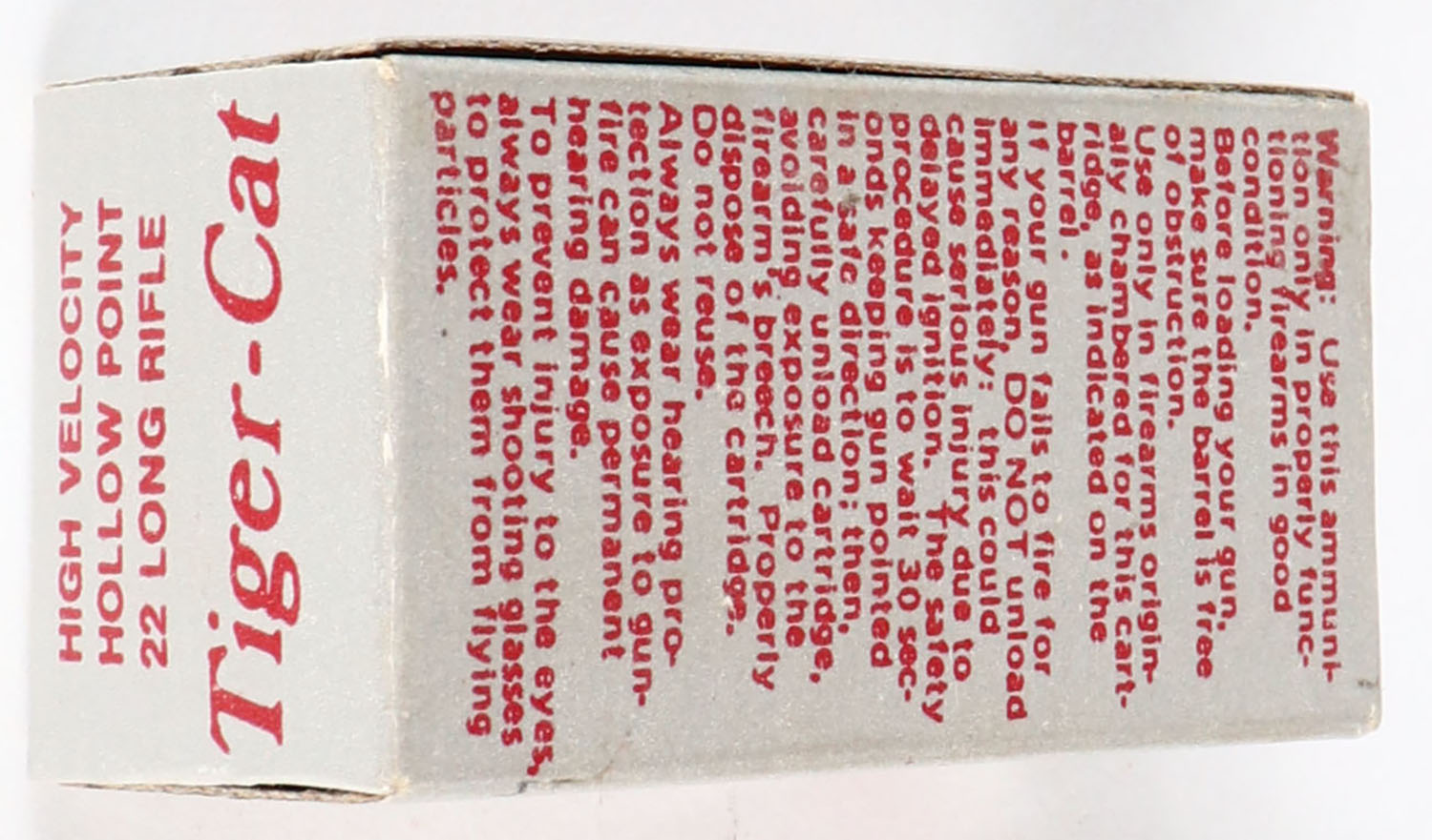 Sovereign, Tiger-Cat, .22 Long Rifle Hollow Point, RHWeb: SGD-1 LR-2, Full, 1pc. Silver & red box, box is near mint with minty color, only very minor edge wear, corners are mostly sharp, end flaps are solid, ammo is excellent. Grade: Excellent ++ - Value: 30 to 90