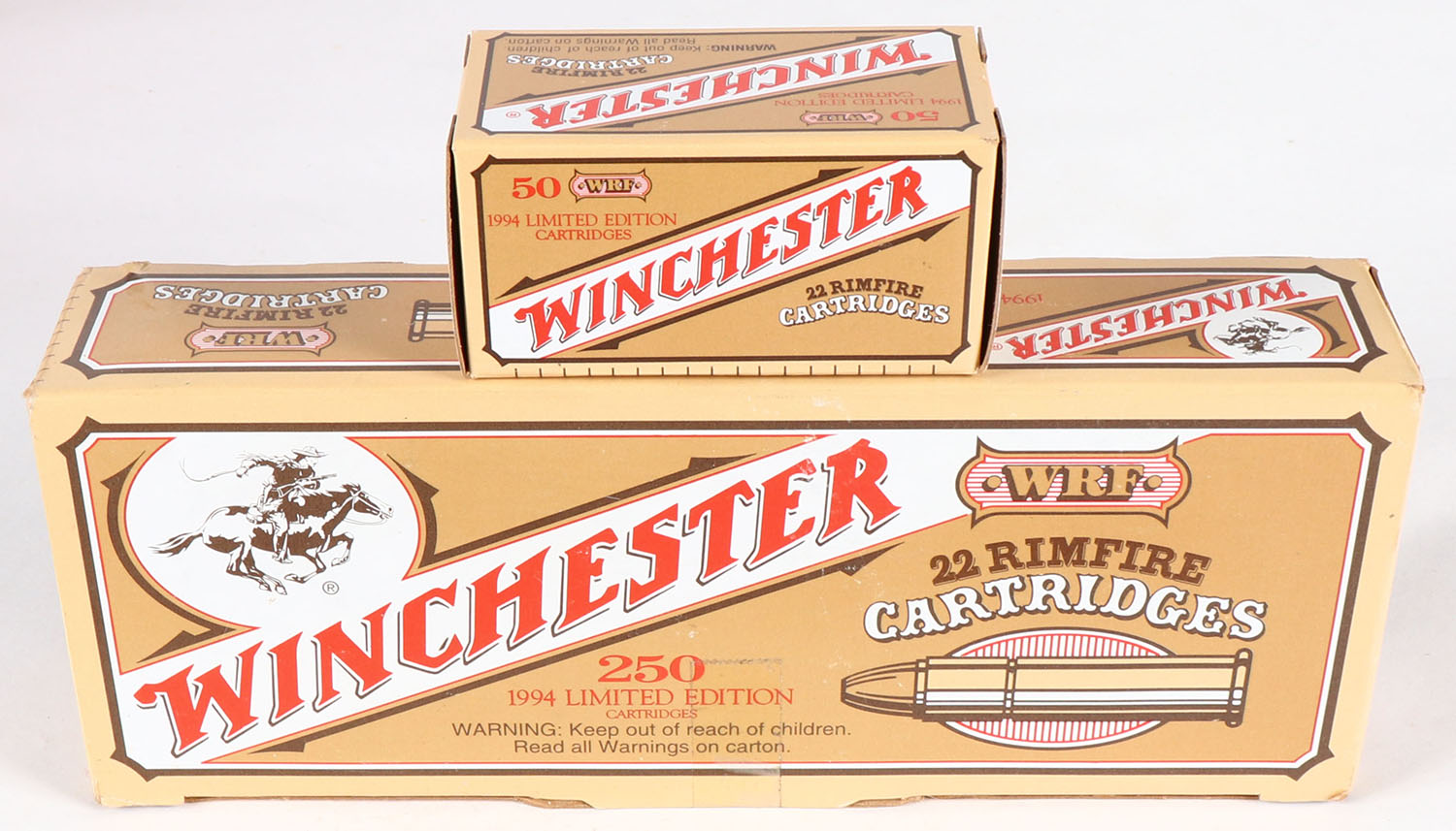 Winchester, .22 WRF, 1994 Limited Edition, Full, 250rds. 1pc. Brown red & tan brick, brick is solid with minty color, very minor corner wear, edges are crisp, top flap is solid, tape on top and front, inside boxes are mint. Grade: Excellent + - Value: 40 to 120