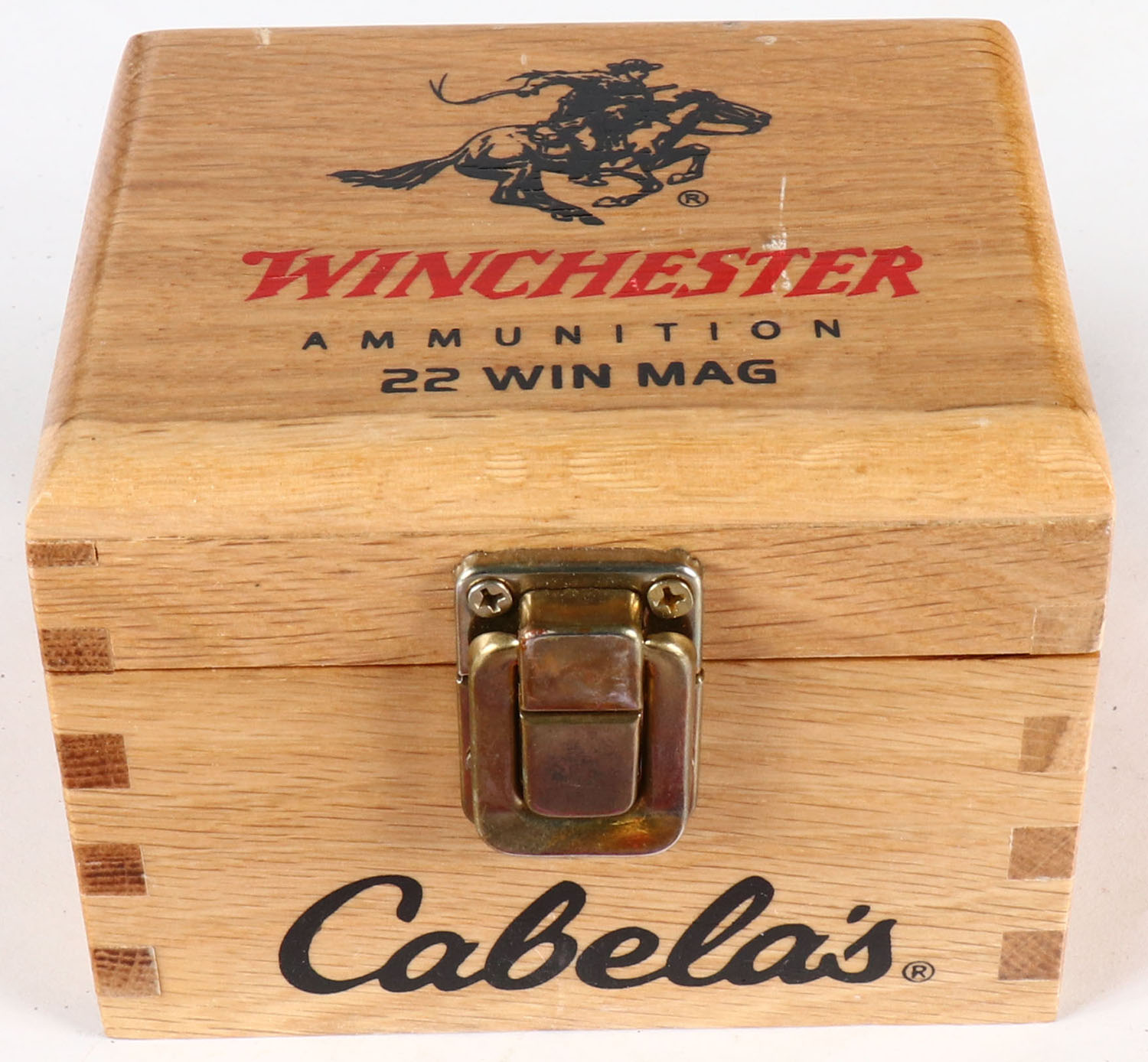 Winchester, Cabela's Promotional Super-X, .22 Win. Mag., 40 Grain Jacketed Hollow Point, 1910 FPS, Full, 150rds. 1pc. Latching wood box containing 1pc. Gray & red bulk box, wood box is near mint with mint color, only very minor shelf wear, inside box is minty, ammo is excellent. Grade: Excellent ++ - Value: 40 to 120