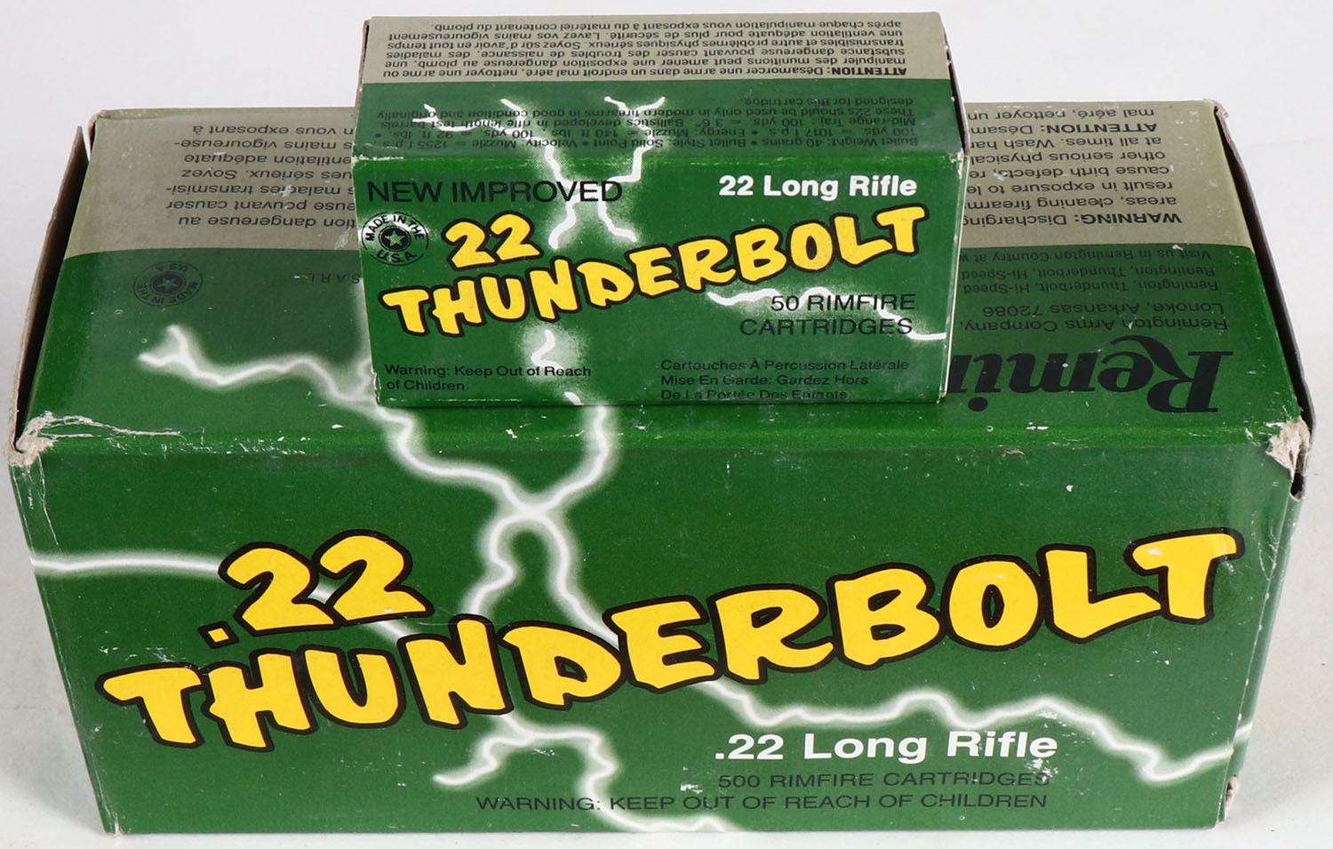 Remington, 22 Thunderbolt, .22 Long Rifle, Hi-Speed, Full, 500rds. 1pc. Green gray & yellow brick, brick is solid with minty color, very minor shelf wear, some corner wear, edges are mostly crisp, end flaps are solid, inside boxes are minty. Grade: Excellent - Value: 30 to 90