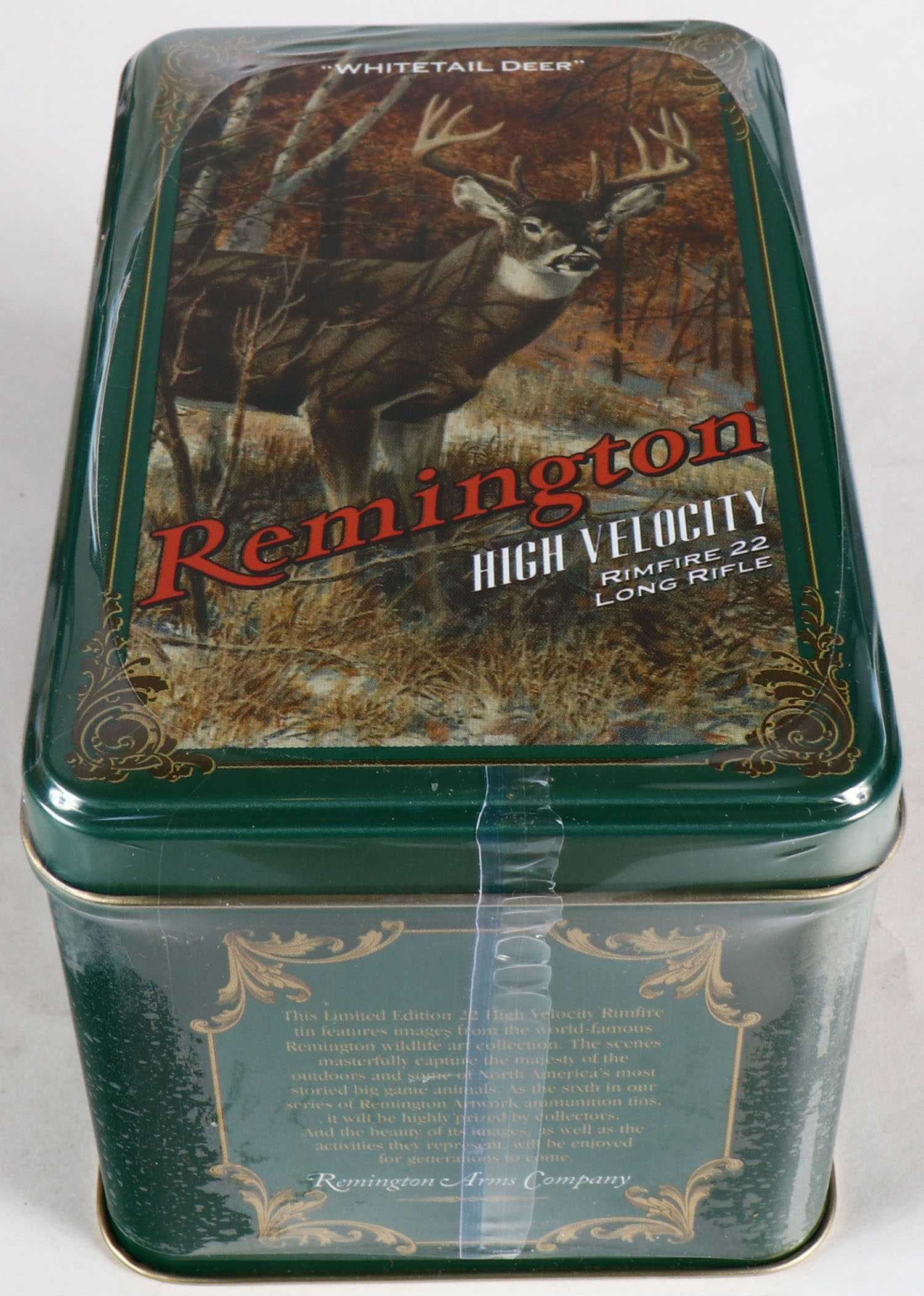 Remington, Limited Edition Collectors Tin, .22 Long Rifle, High Velocity, 1pc. FULL & SEALED, 400rds. Hinged tin features buck in the autumn woods. Grade: MINT - Value: 30 to 90