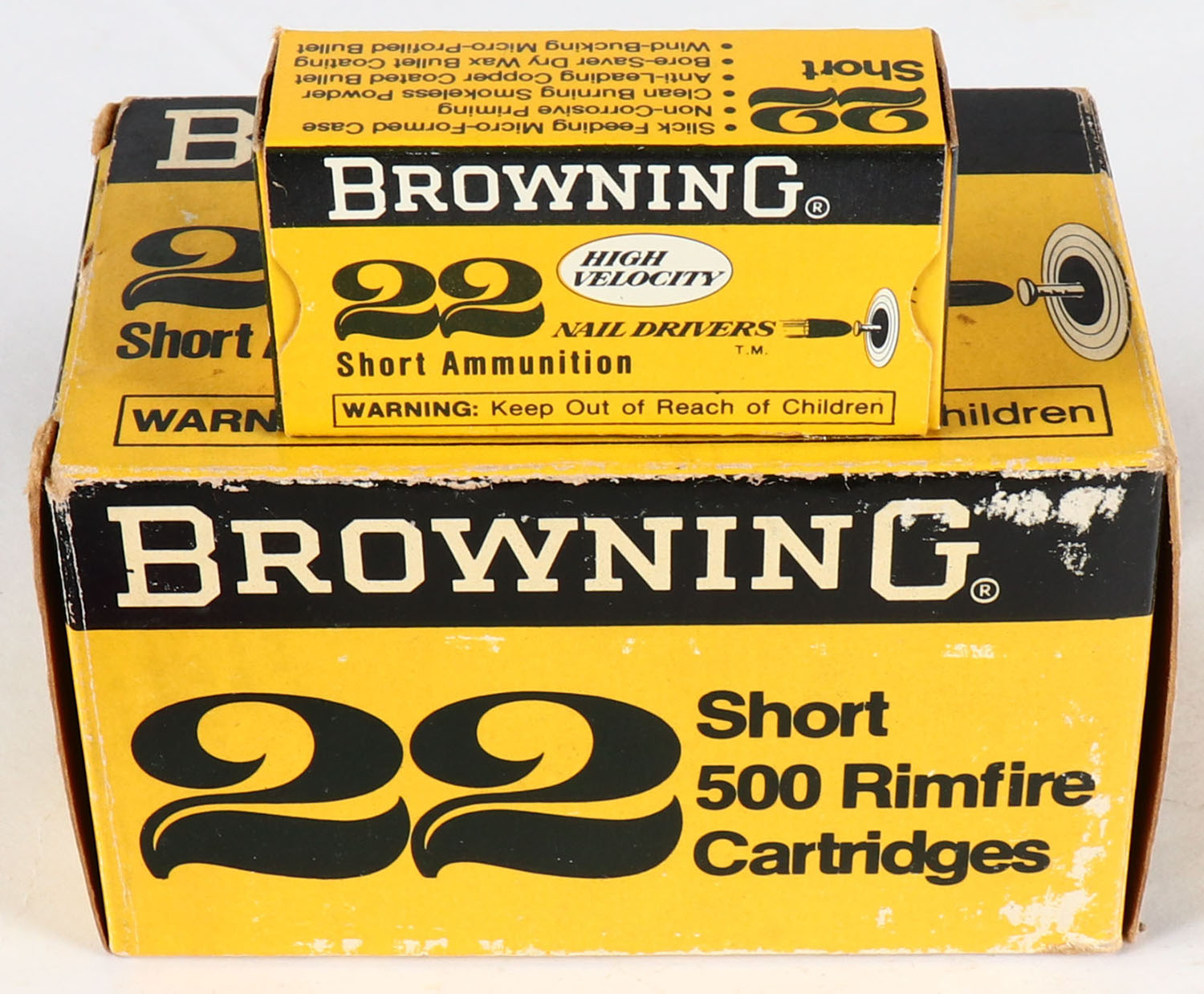 Browning, Nail Drivers, .22 Short, Full, 500rds. 1pc. Yellow black & white brick, brick is solid with excellent color, very minor shelf & edge wear, minor corner wear, end flaps are solid, inside boxes are minty. Grade: Excellent - Value: 500 to 1500