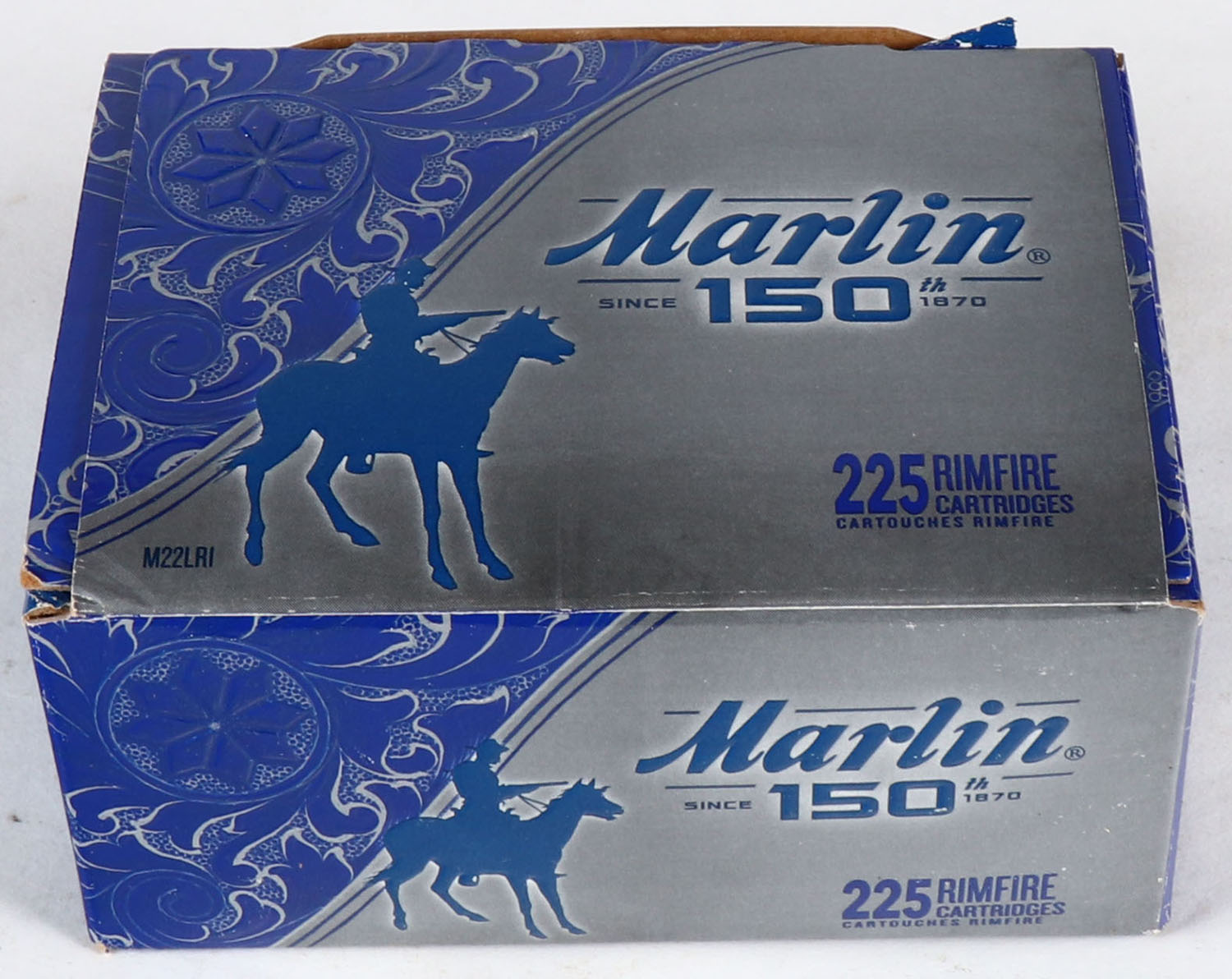 Marlin, 150th Anniversary, .22 Long Rifle Hollow Point, 1280 FPS, Full, 225rds. Silver & blue bulk box, box is MINT with minty color, corners are sharp, edges are crisp, top flap is solid, ammo is mint. Grade: MINT - Value: 200 to 600