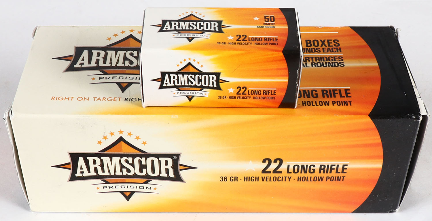 Armscor, Precision, .22 Long Rifle Hollow Point, 36 Grain HP, Full 500rds., 1pc. White orange & black brick, brick is solid with minty color, very minor corner wear, edges are crisp, end flaps are solid, inside boxes are mint. Grade: Excellent ++ - Value: 20 to 60