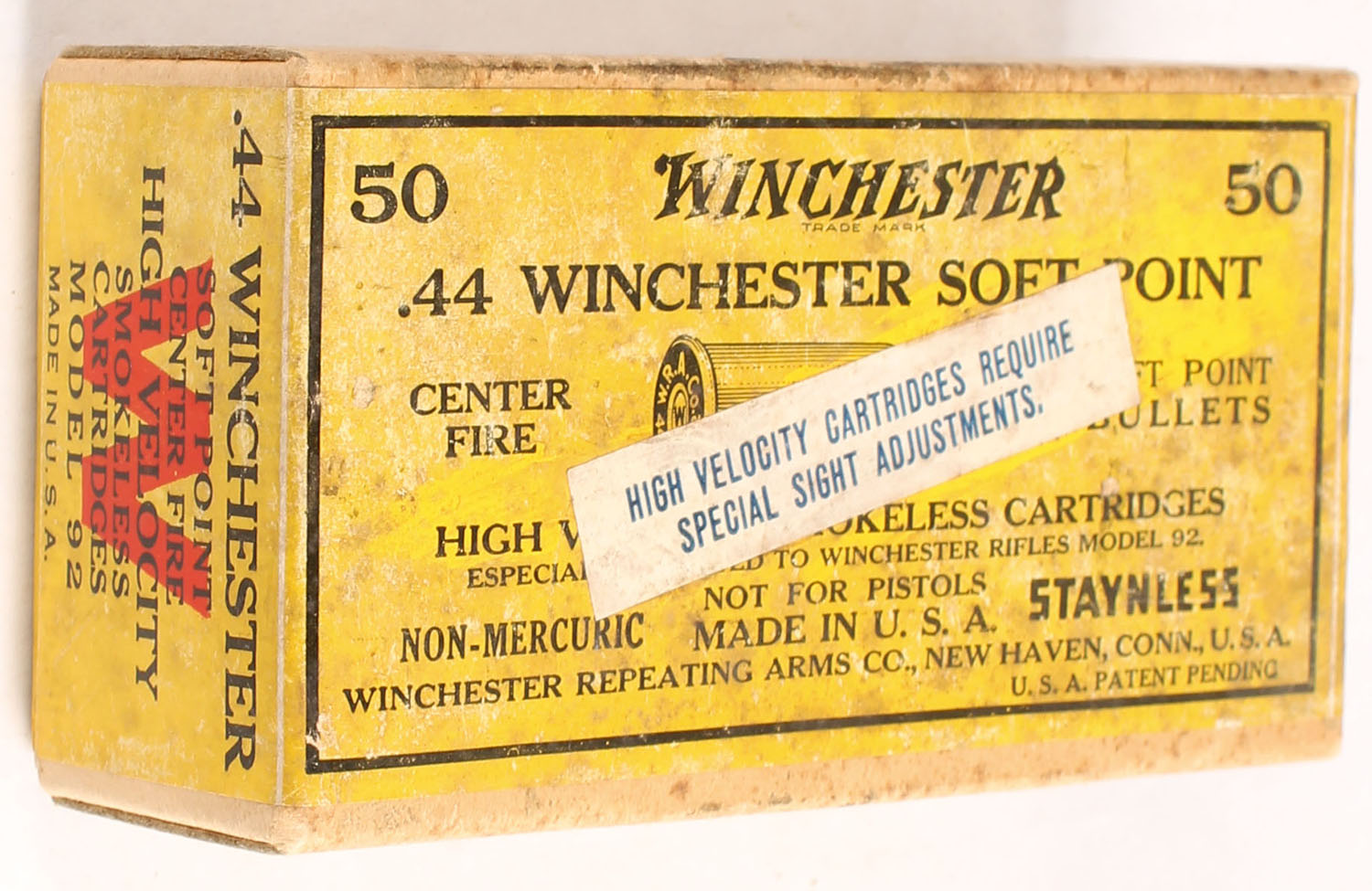 Winchester, High Velocity Smokeless Cartridges, .44 Winchester Soft Point, FULL & SEALED, 2pc. Buff box with yellow wraparound label & white sight adjustment over-label, box is solid with very good color, some age soiling & staining, corners are mostly sharp, edges are crisp, labels are intact. Grade: Very Good ++ - Value: 300 to 900