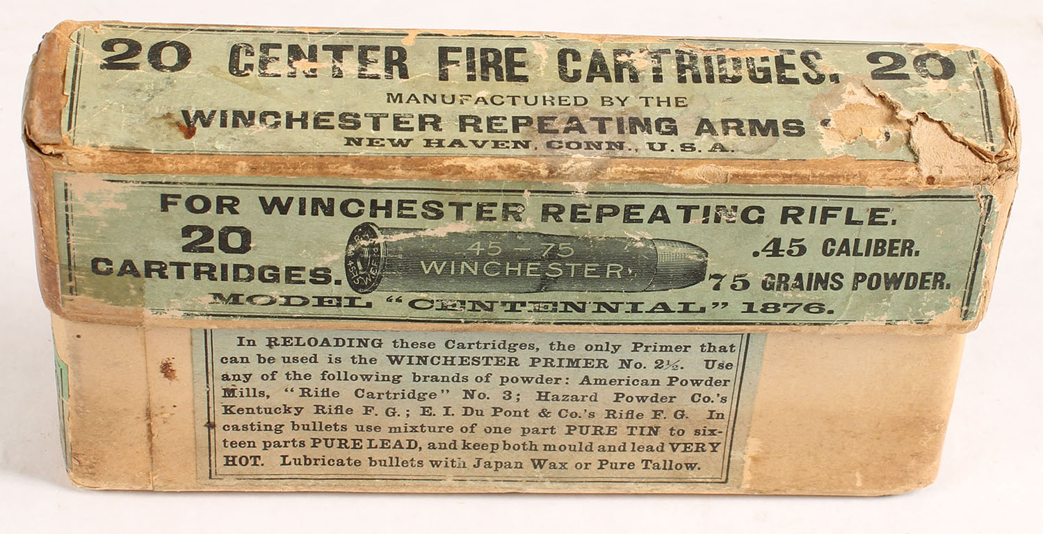 Winchester, Center Fire Cartridges, .45-75 Winchester, Full of mixed WRA H/S, 2pc. Buff box with green labels, box is solid with very good color, some age soiling & shelf wear, edge & corner wear, tape on left end of lid, labels are intact, ammo is excellent. Grade: Very Good - Value: 100 to 400