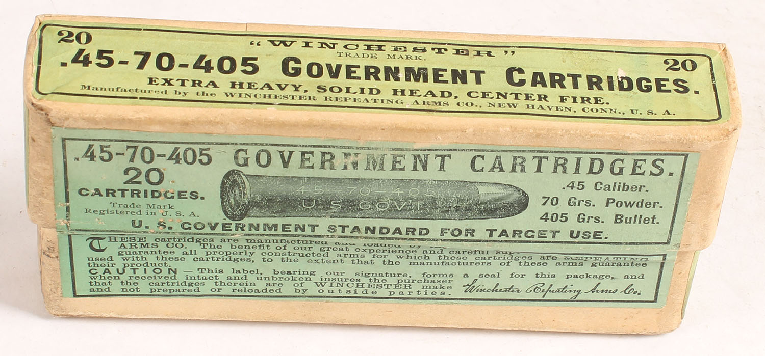 Winchester, Government Cartridges, .45-70-405, Extra Heavy, Solid Head, FULL & SEALED, 2pc. Buff box with green labels, box is solid with excellent color, very minor age soiling, minor corner wear, edges are mostly crisp, labels are intact. Grade: Excellent + - Value: 100 to 400