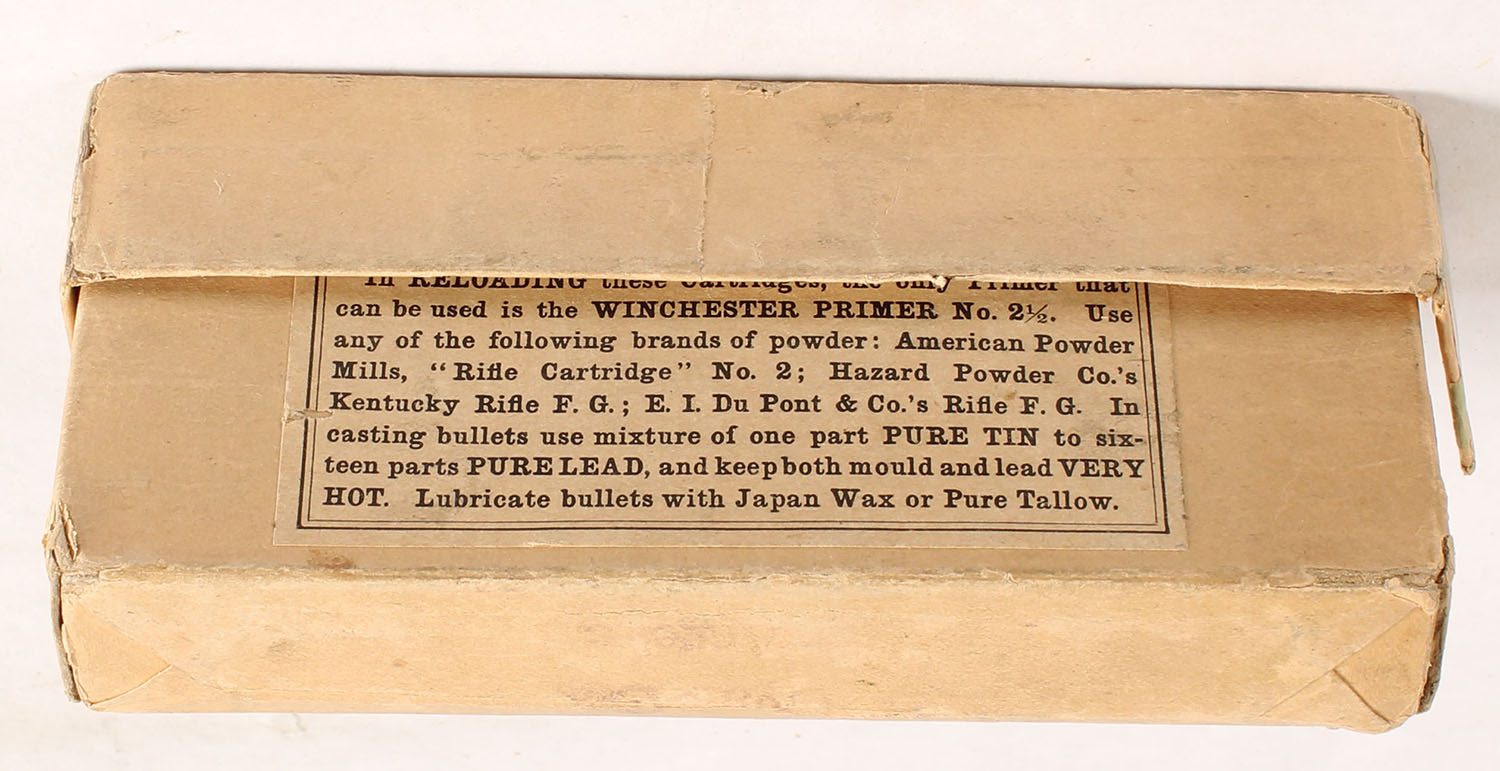 Winchester, Center Fire Cartridges, .40-82 Winchester, 260 Gr. Lead Bullets, Full, 2pc. Buff box with green labels, box is solid with excellent color, very minor age soiling & color fading on top, multiple full & partial seam splits to left end of lid, partial seam split to front edge of lid, some edge & corner wear, labels are intact, front label is still sealed, ammo is excellent. Grade: Very Good - Value: 150 to 450