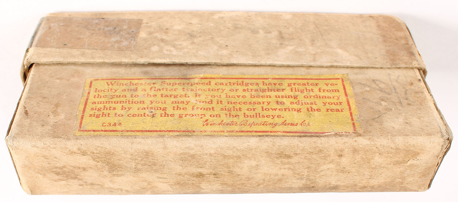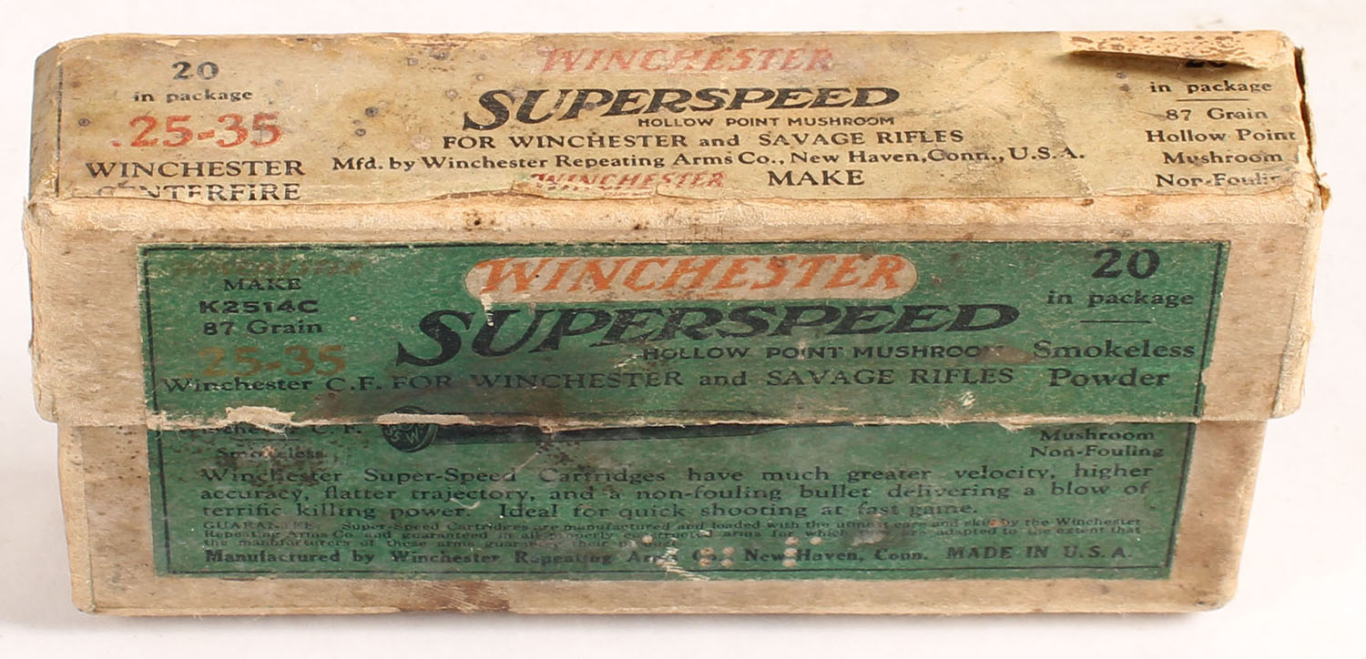 Winchester, SuperSpeed, .25-35 Winchester, Partial 11rds. of incorrect ammo, full, 2pc. Buff box with green labels, box is solid with fair to good color, age soiling, staining, some shelf wear, some edge & corner wear, labels are intact, ammo is very good. Grade: Good ++ - Value: 10 to 50
