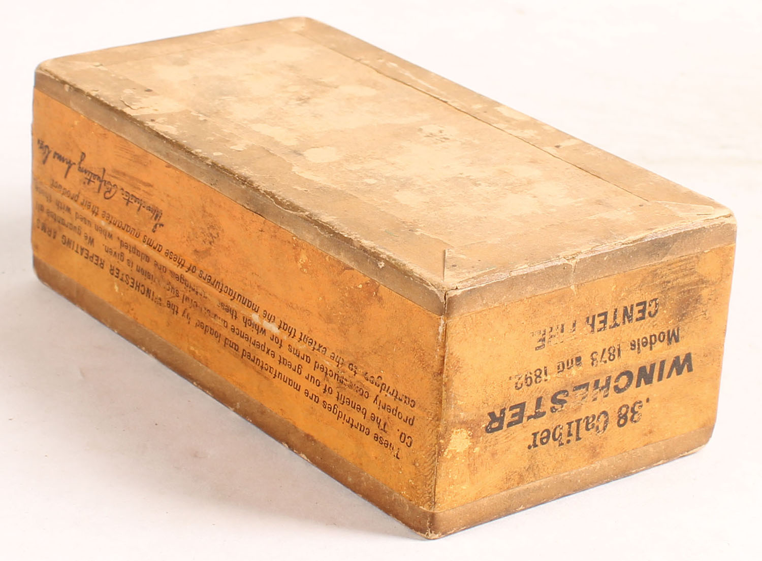 Winchester, .38 Winchester Center Fire, Solid Head, FULL & SEALED, 2pc. Buff box with green top & orange side sealing labels, box is solid with very good color, age soiling, some shelf wear, minor edge & corner wear, top has been written on, labels are intact. Grade: Very Good - Value: 100 to 300