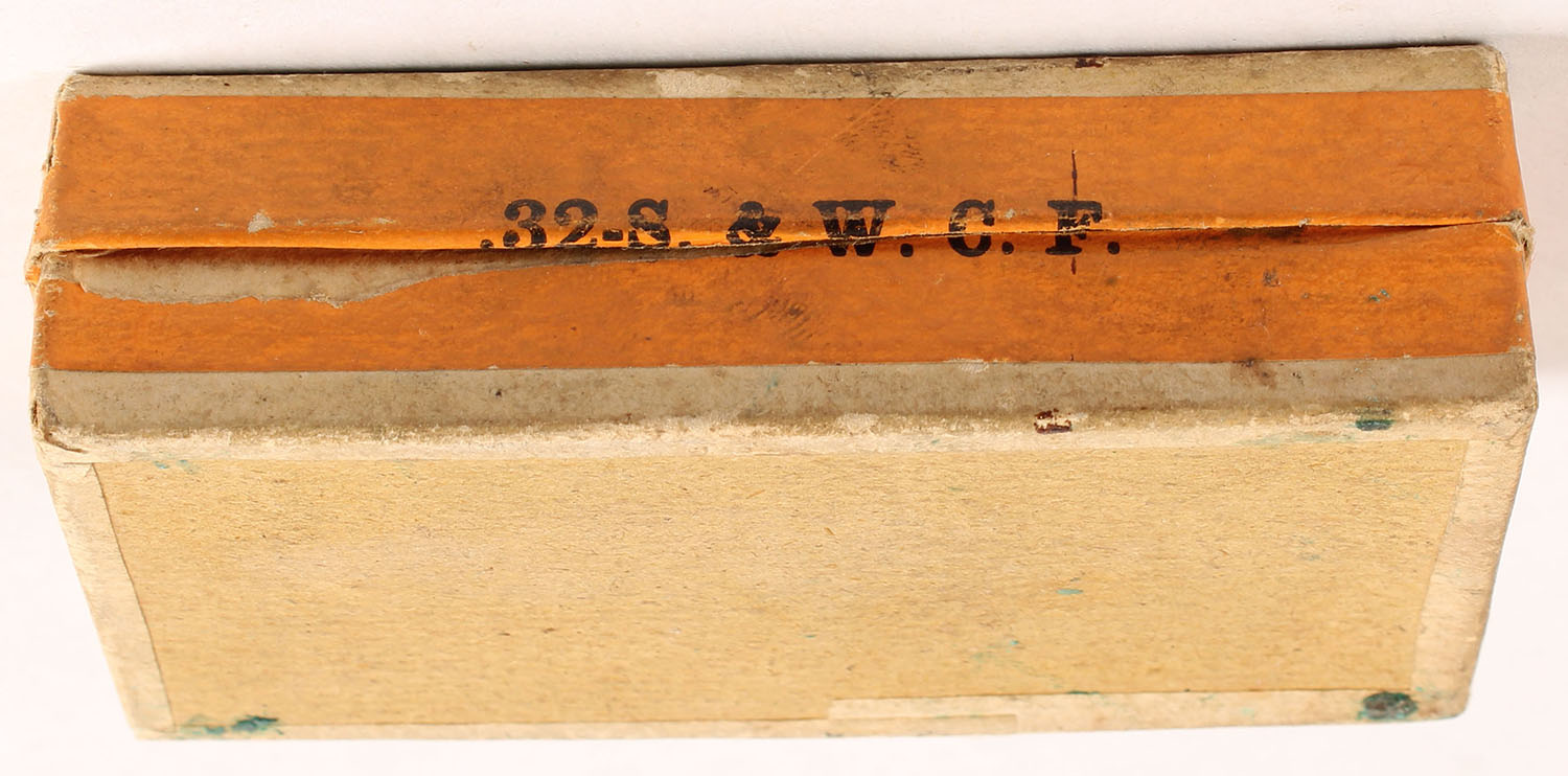 Winchester, Solid Head Central Fire, .32 Smith & Wesson, Partial 17rds. 2pc. Buff box with green top & orange side sealing labels, box is solid with very good to excellent color, minor age soiling & shelf wear, some edge & corner wear, labels are intact, ammo is good. Grade: Very Good ++ - Value: 10 to 50