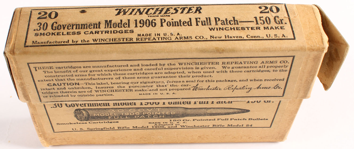Winchester, Smokeless Cartridges, .30 Government Model 1906 (.30-06), 150 Grain Pointed Full Patch Bullets, Full, 2pc. Buff box with buff label, box is solid with excellent color, factory seam on lid has partially unadhered, some edge & corner wear, label is intact, ammo is very good. Grade: Very Good ++ - Value: 10 to 50