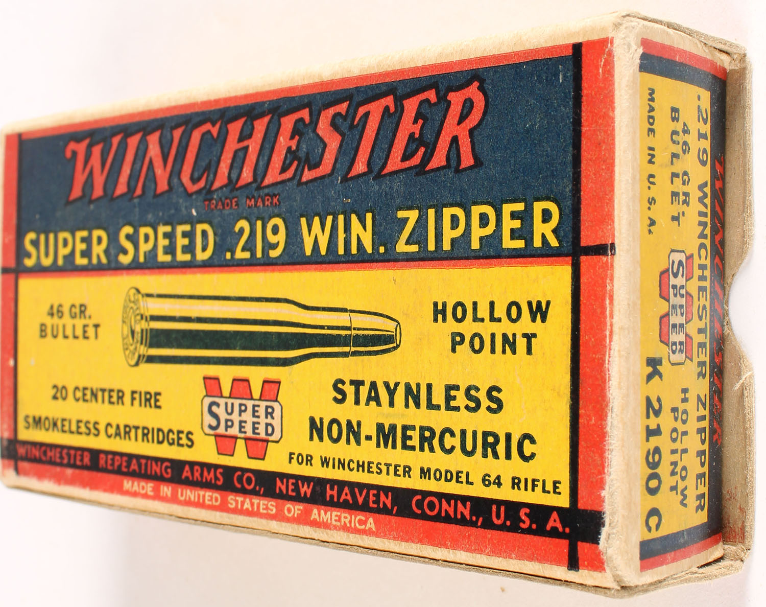 Winchester, Super Speed, .219 Zipper, 46 Gr. Hollow Point Bullet, Full, 1pc. Yellow blue & red box with insert, box is solid with excellent color, very minor color fading & corner wear, edges are mostly crisp, top has been written on, right end flap is torn, left end flap is solid, insert is very good, ammo is excellent. Grade: Excellent - Value: 100 to 400