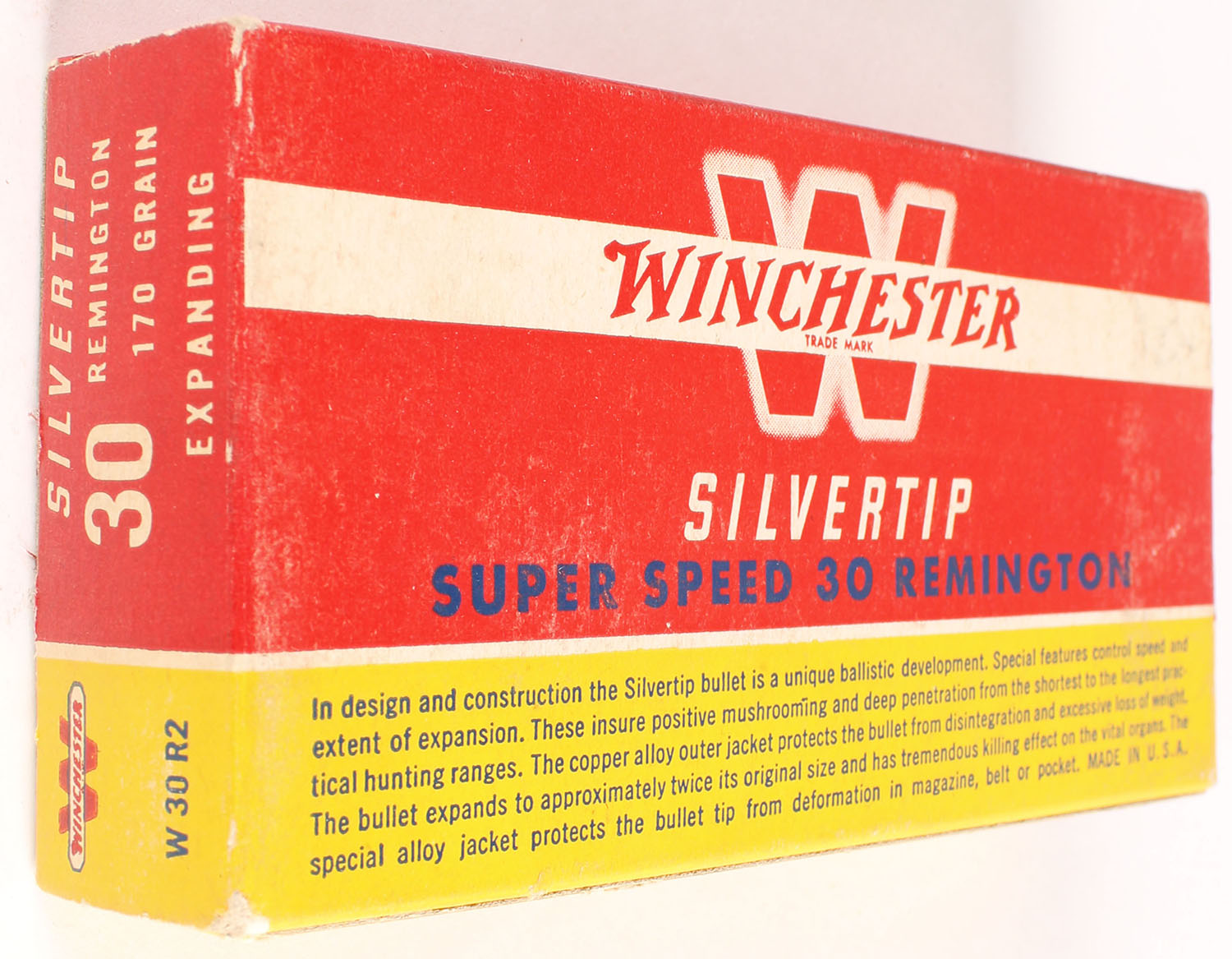 Winchester, Silvertip, .30 Remington, 170 Grain Controlled Expanding, Full, 1pc. Red yellow & white box, box is solid with excellent color, minor shelf & corner wear, edges are crisp, top has been written on, end flaps are solid, ammo is excellent to minty. Grade: Excellent - Value: 20 to 80