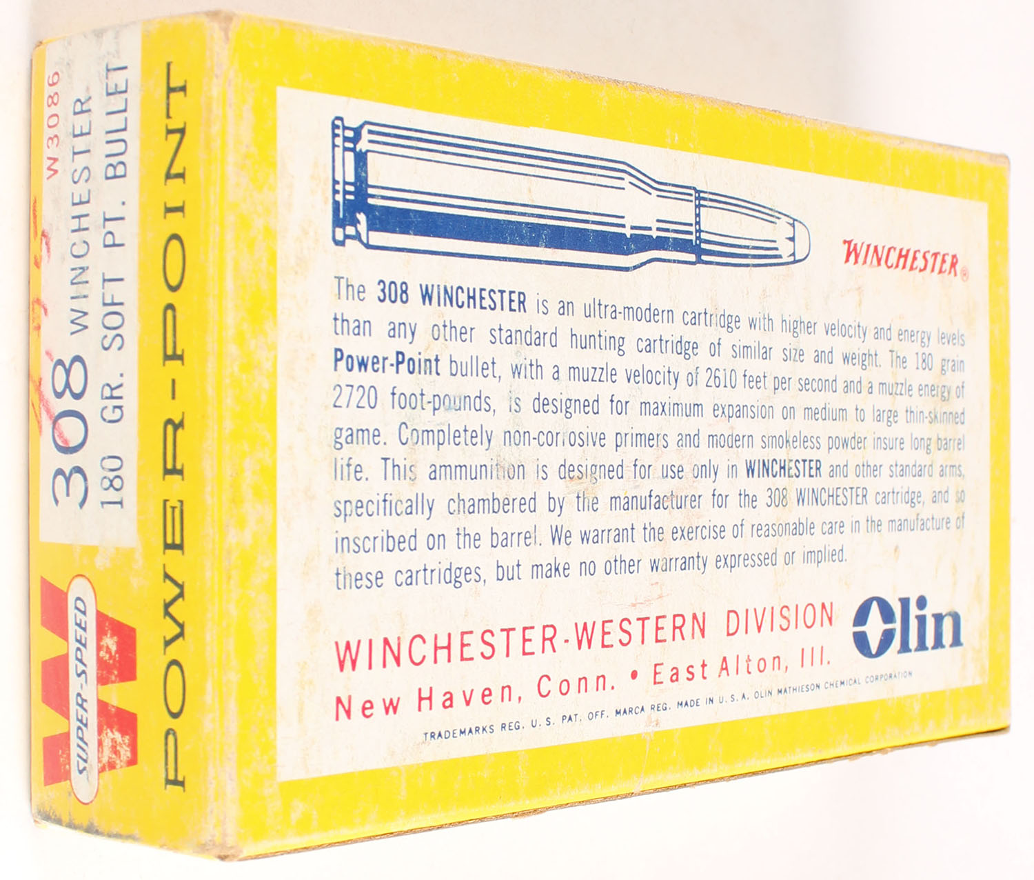 Winchester, Power-Point, .308 Winchester, 180 Gr. Soft Point Bullet, Full, 1pc. Yellow white & red box, box is solid with excellent color, some shelf wear, minor corner wear, very minor edge wear, top has been written on, end flaps are solid, ammo is excellent. Grade: Excellent - Value: 14 to 40