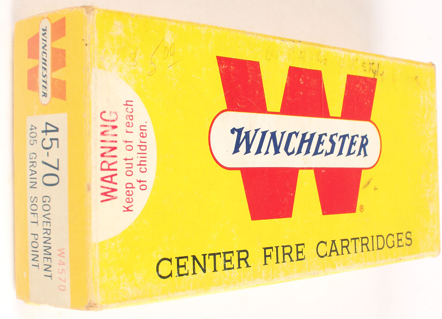 Winchester, Center Fire Cartridges, .45-70 Government, 405 Grain Soft Point, Full of incorrect ammo, 1pc. Yellow white & red box, box is solid with excellent color, some age soiling & staining, top has been written on, minor corner wear, edges are mostly crisp, end flaps are solid, ammo is very good to excellent. Grade: Very Good ++ - Value: 24 to 72