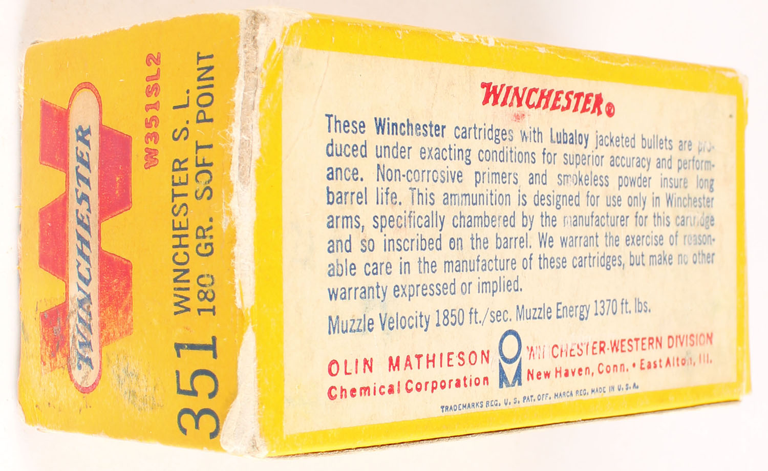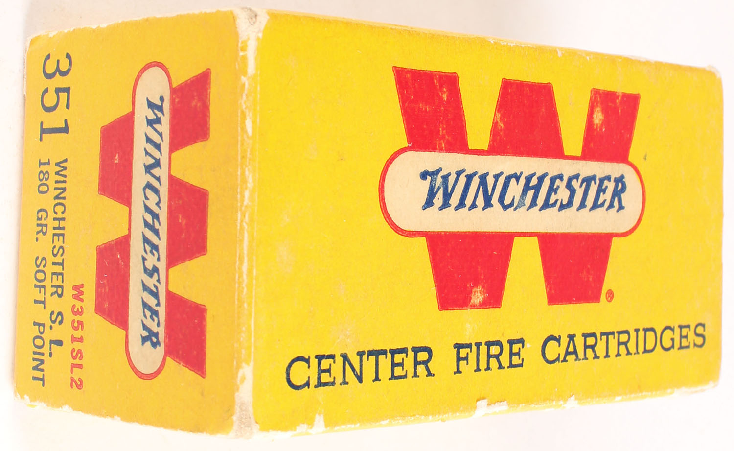 Winchester, Center Fire Cartridges, .351 Winchester Self-Loading, 180 Grain Soft Point, Full, 1pc. Yellow white & red box, box is solid with excellent color, minor age soiling, some corner wear, minor edge wear, end flaps are solid, ammo is excellent. Grade: Excellent - Value: 80 to 240