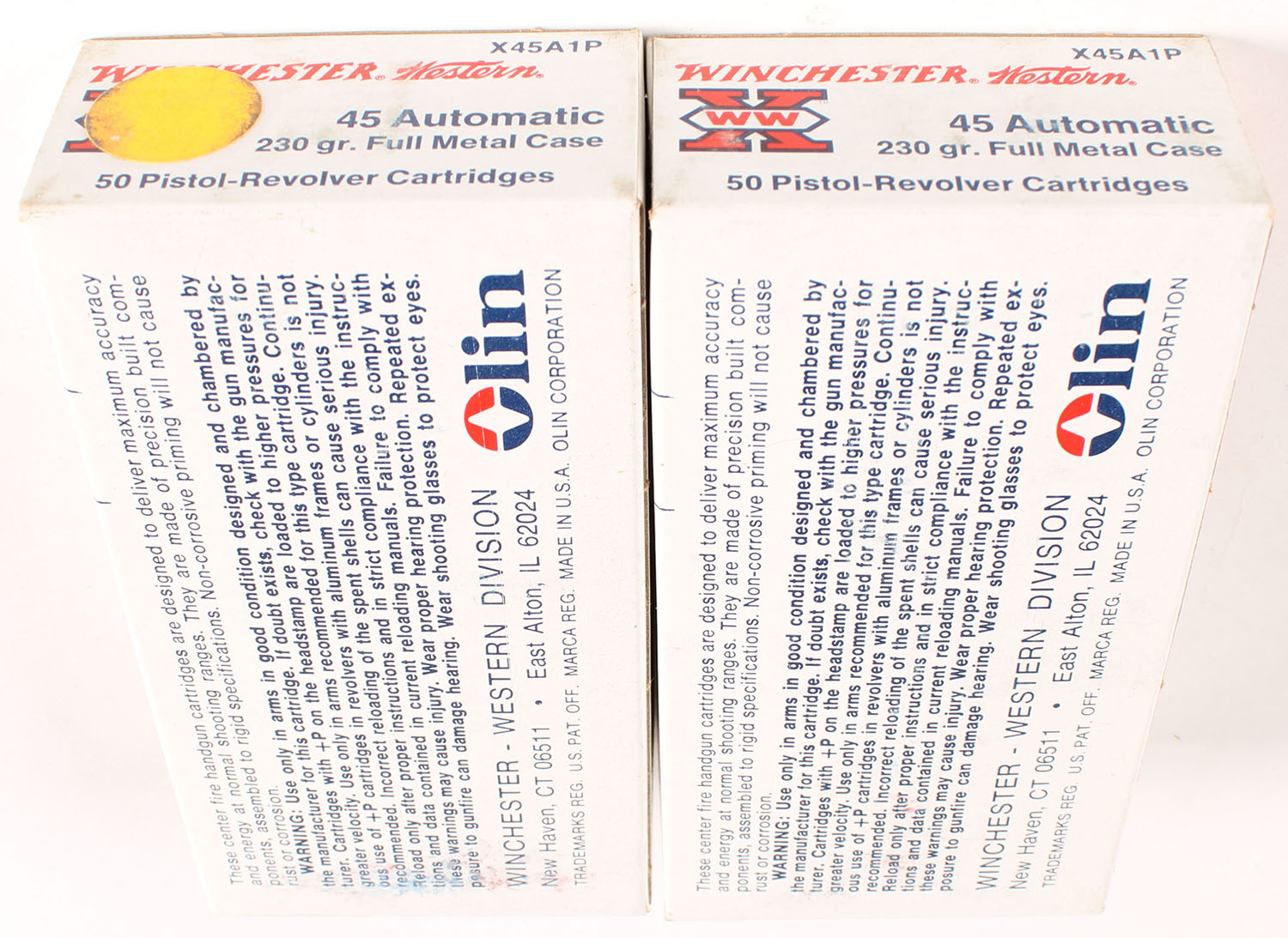 Winchester-Western, Lot of (2), X, .45 Automatic, 230 Grain Full Metal Case, both boxes full with excellent color, corners are sharp, edges are crisp, end flaps are solid, ammo is minty. Grade: Excellent ++ - Value: 20 to 60