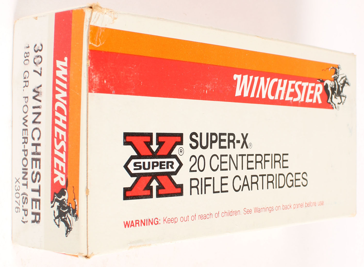 Winchester, Super-X, .307 Winchester, 180 Gr. Power-Point, Full, 1pc. Gray white & orange box, box is solid with excellent color, very minor shelf wear, minor corner wear, edges are crisp, end flaps are solid, ammo is excellent. Grade: Excellent - Value: 10 to 50