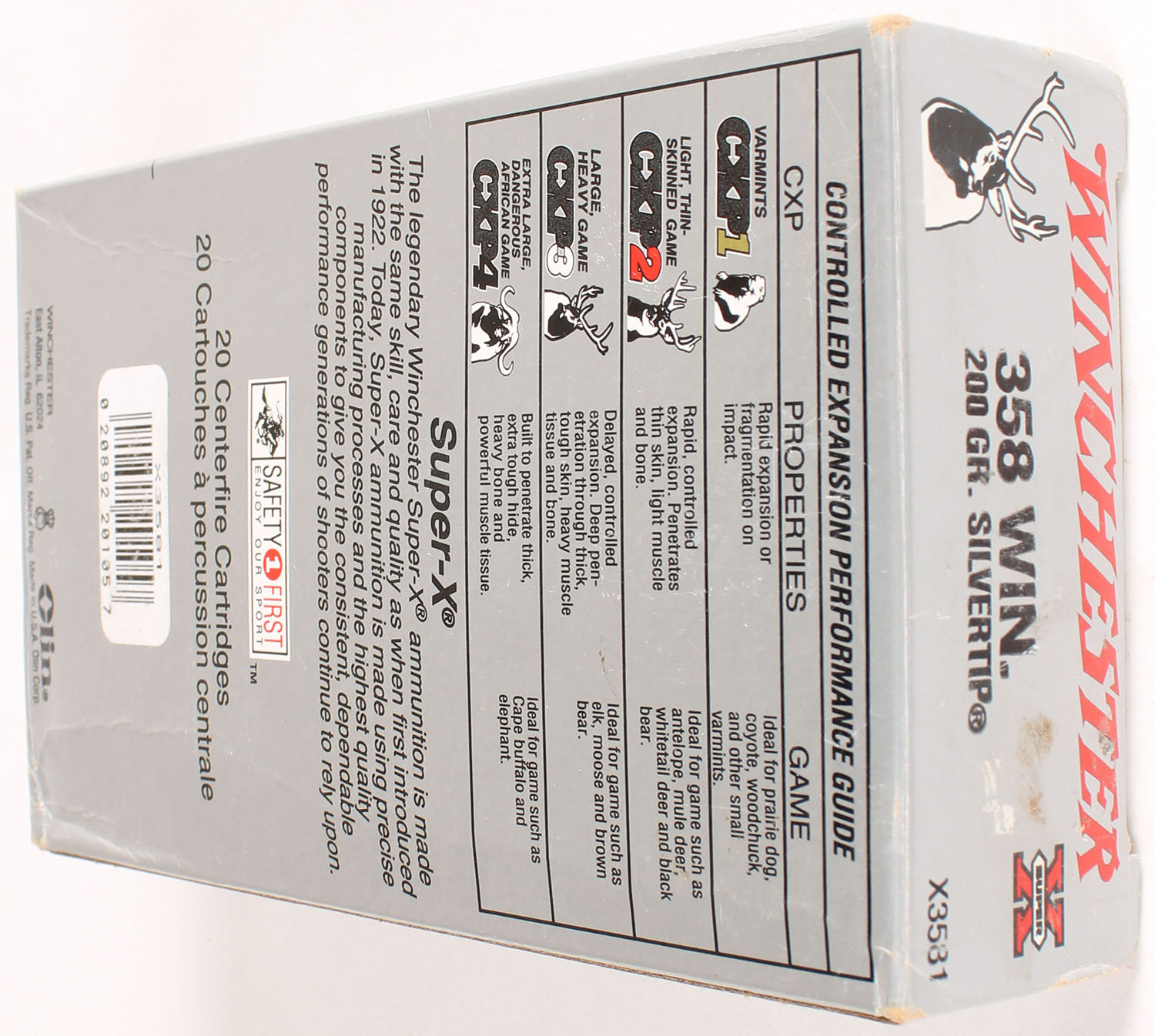 Winchester, Super X, .358 Winchester, 200 Grain Silvertip, Full, 1pc. Silver & red box, box is solid with minty color, crease on top, ammo is minty. Grade: Excellent ++ - Value: 30 to 90