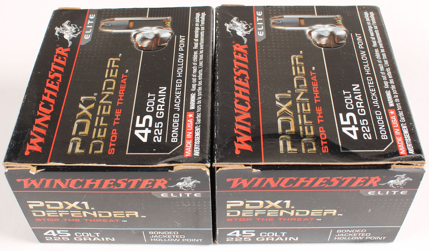 Winchester, Lot of (2), PDX1 Defender, .45 Colt, 225 Grain Bonded Jacketed Hollow Point, Full, 1pc. Black & red boxes, boxes are near mint with minty color, only very minor corner wear, edges are crisp, end flaps are solid, ammo is minty. Grade: Excellent ++ - Value: 20 to 60