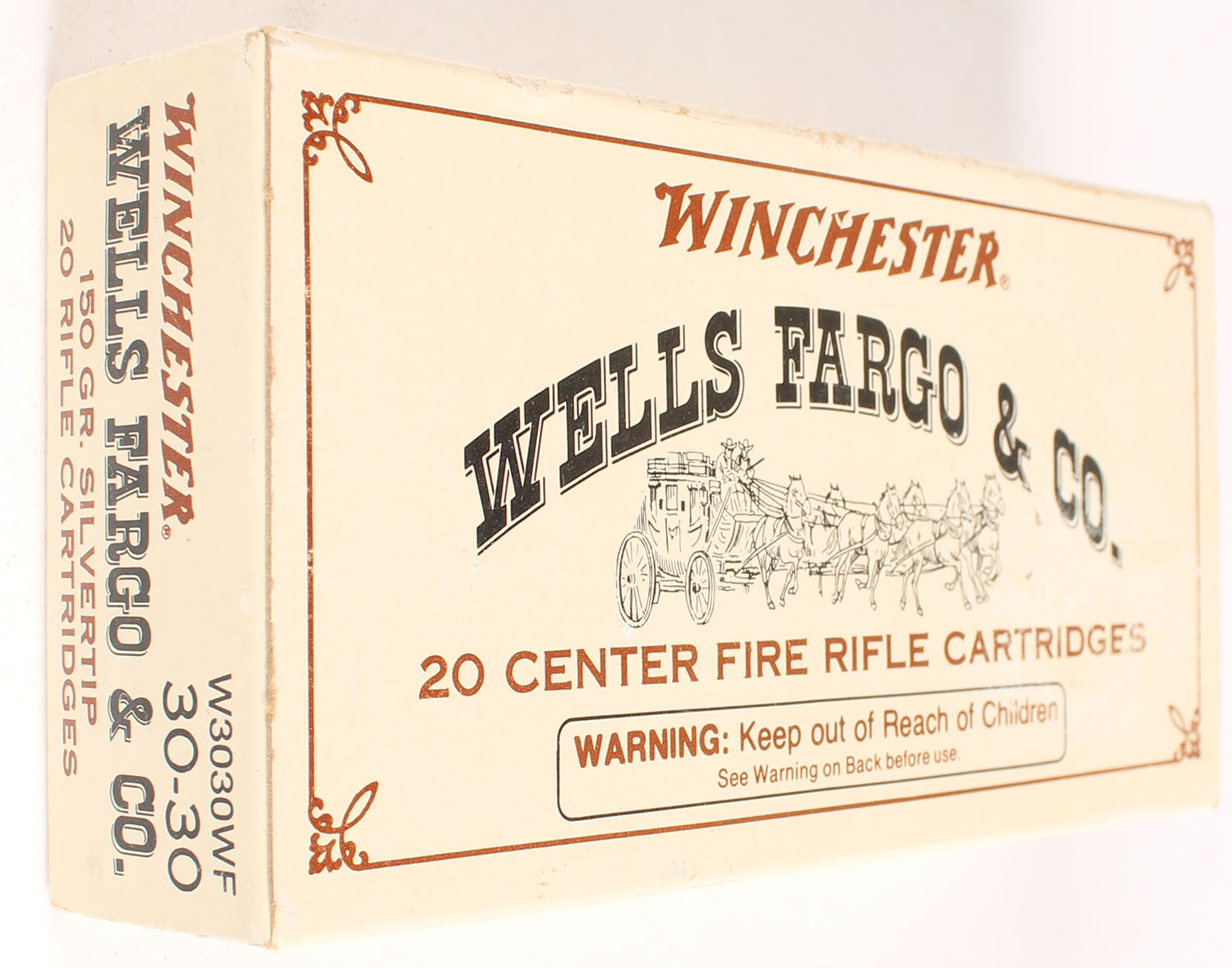 Winchester, Wells Fargo & Co., .30-30 Winchester, 150 Gr. Silvertip, Full, 1pc. Tan brown & black box, box is solid with excellent color to minty color, very minor shelf & corner wear, edges are crisp, end flaps are solid, ammo is minty. Grade: Excellent + - Value: 40 to 120