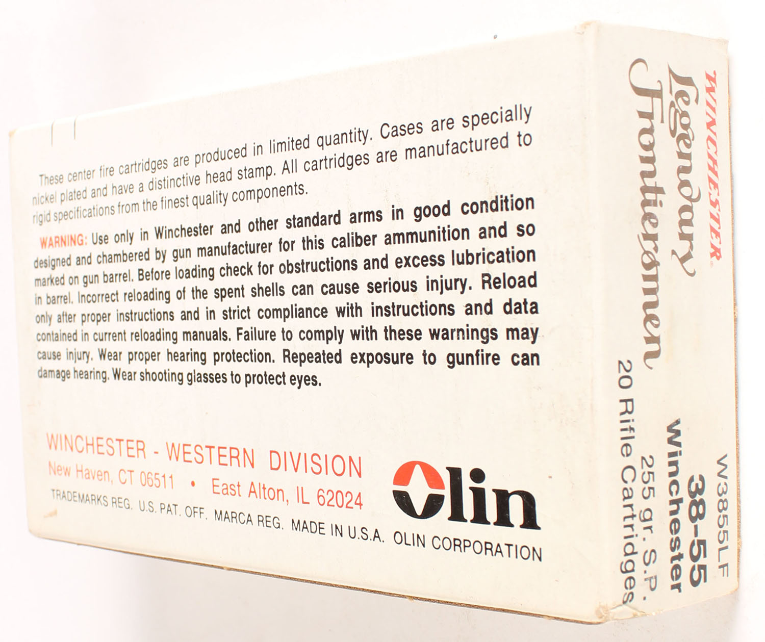 Winchester, Legendary Frontiersmen, .38-55 Winchester, 255 Grain Soft Point, Full, 1pc. Multi-colored box, box is solid with excellent color, very minor shelf & corner wear, edges are crisp, end flaps are solid, ammo is excellent to minty. Grade: Excellent + - Value: 40 to 120