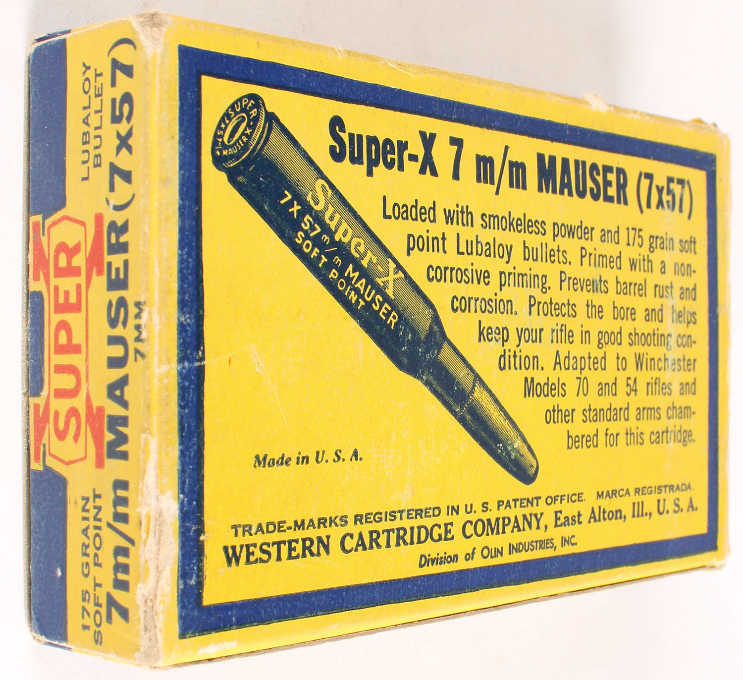 Western, Super-X, 7mm Mauser (7x57), 175 Grain Soft Point Lubaloy Bullet, Full, 1pc. Yellow blue & red box, left end flap is torn, excellent color, very minor age soiling & shelf wear, some edge & corner wear, right end flap is solid, ammo is excellent. Grade: Very Good + - Value: 16 to 60