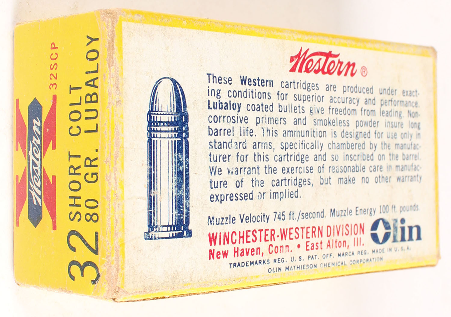 Western, X, .32 Short Colt, 80 Gr. Lubaloy Bullet, Full, 1pc. Yellow white & red box, box is solid with excellent color, very minor shelf & edge wear, minor corner wear, end flaps are solid, ammo is excellent. Grade: Excellent - Value: 40 to 120