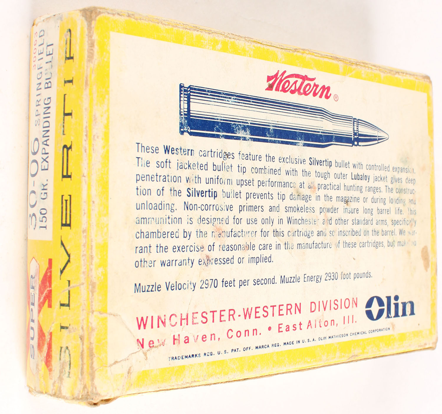 Western, Super-X Silvertip, .30-06 Springfield, 150 Grain Expanding Bullet, Full, 1pc. Yellow white & red box, box is solid with good to very good color, minor age soiling, shelf wear, edge & corner wear, end flaps are solid, ammo is excellent. Grade: Very Good - Value: 16 to 60